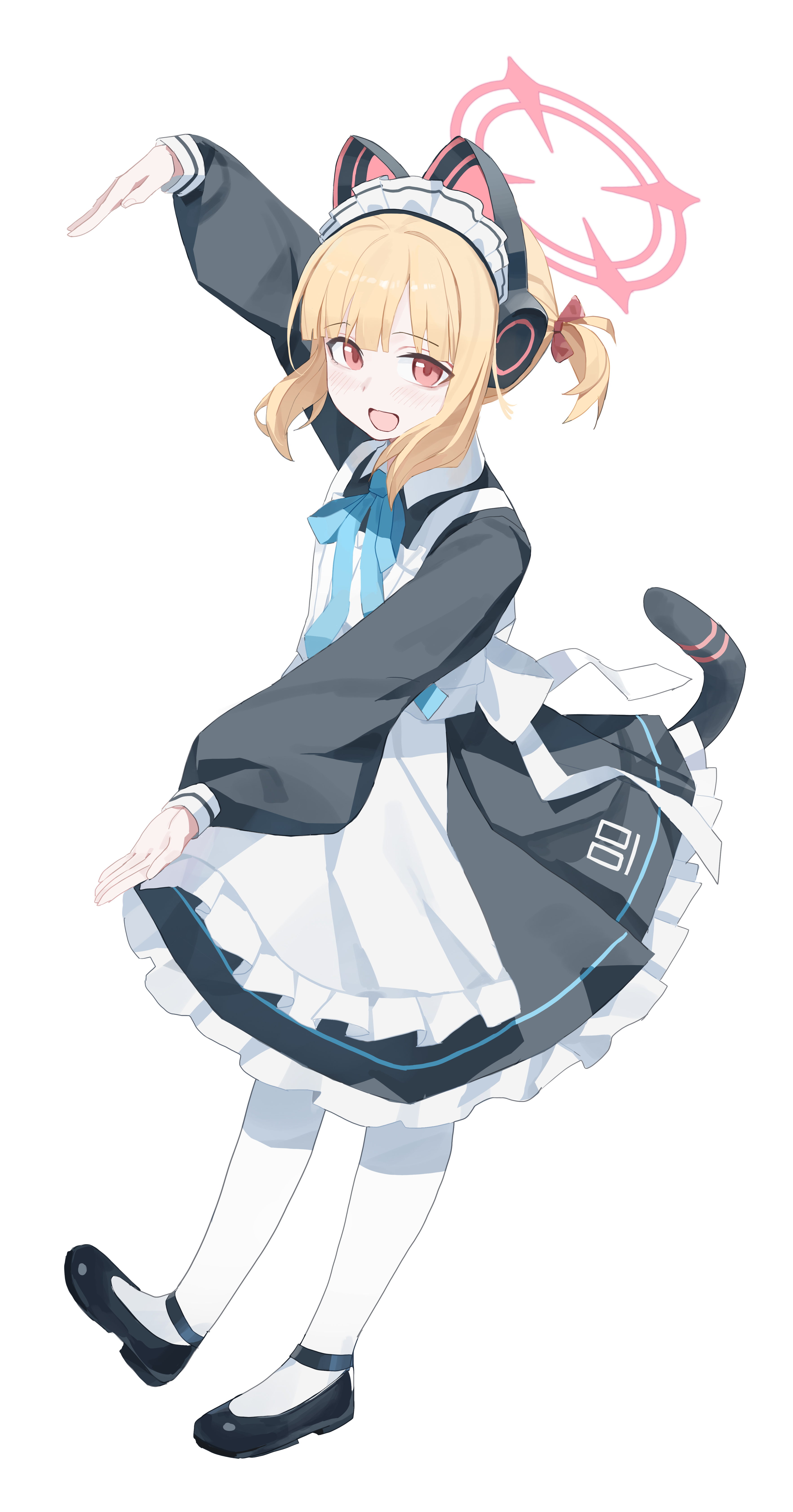 1girl :d absurdres animal_ear_headphones animal_ears apron aqua_ribbon arm_up back_bow black_dress black_shoes black_tail blonde_hair blue_archive blunt_bangs blush bow cat_ear_headphones cat_ears cat_tail chinese_commentary collared_dress commentary contrast_collar cupping_hand dress fake_animal_ears fake_tail fanshuimucishen frilled_apron frilled_dress frills full_body hair_bow halo headphones highres long_sleeves looking_at_viewer maid maid_apron maid_headdress momoi_(blue_archive) momoi_(maid)_(blue_archive) neck_ribbon number_print official_alternate_costume official_alternate_hairstyle open_mouth outstretched_arms pantyhose parted_bangs pink_halo puffy_long_sleeves puffy_sleeves red_bow red_eyes ribbon shoes short_hair short_twintails sidelocks simple_background smile solo standing tail tail_raised tail_under_clothes toes_up twintails white_apron white_background white_bow white_headdress white_pantyhose