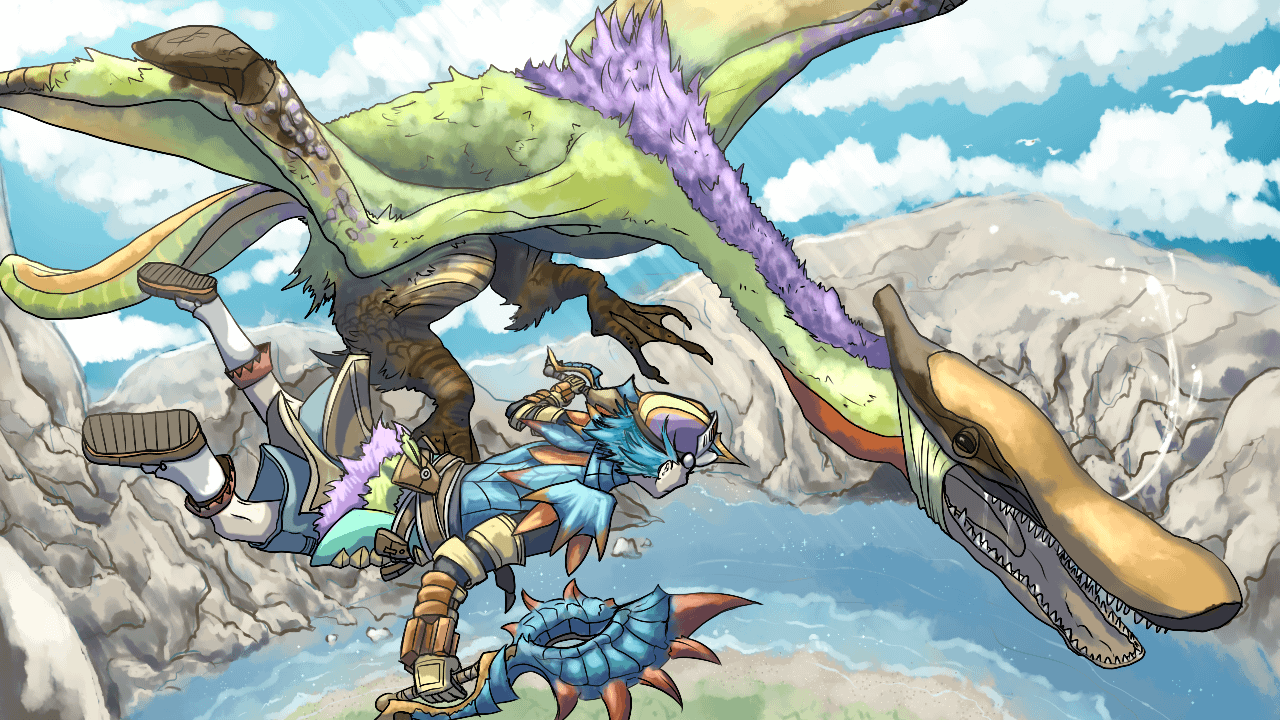 1boy action armor artist_request capcom claws creature dragon fantasy flying monster monster_hunter_(series) mountainous_horizon open_mouth qurupeco_(monster_hunter) river sky teeth weapon wings