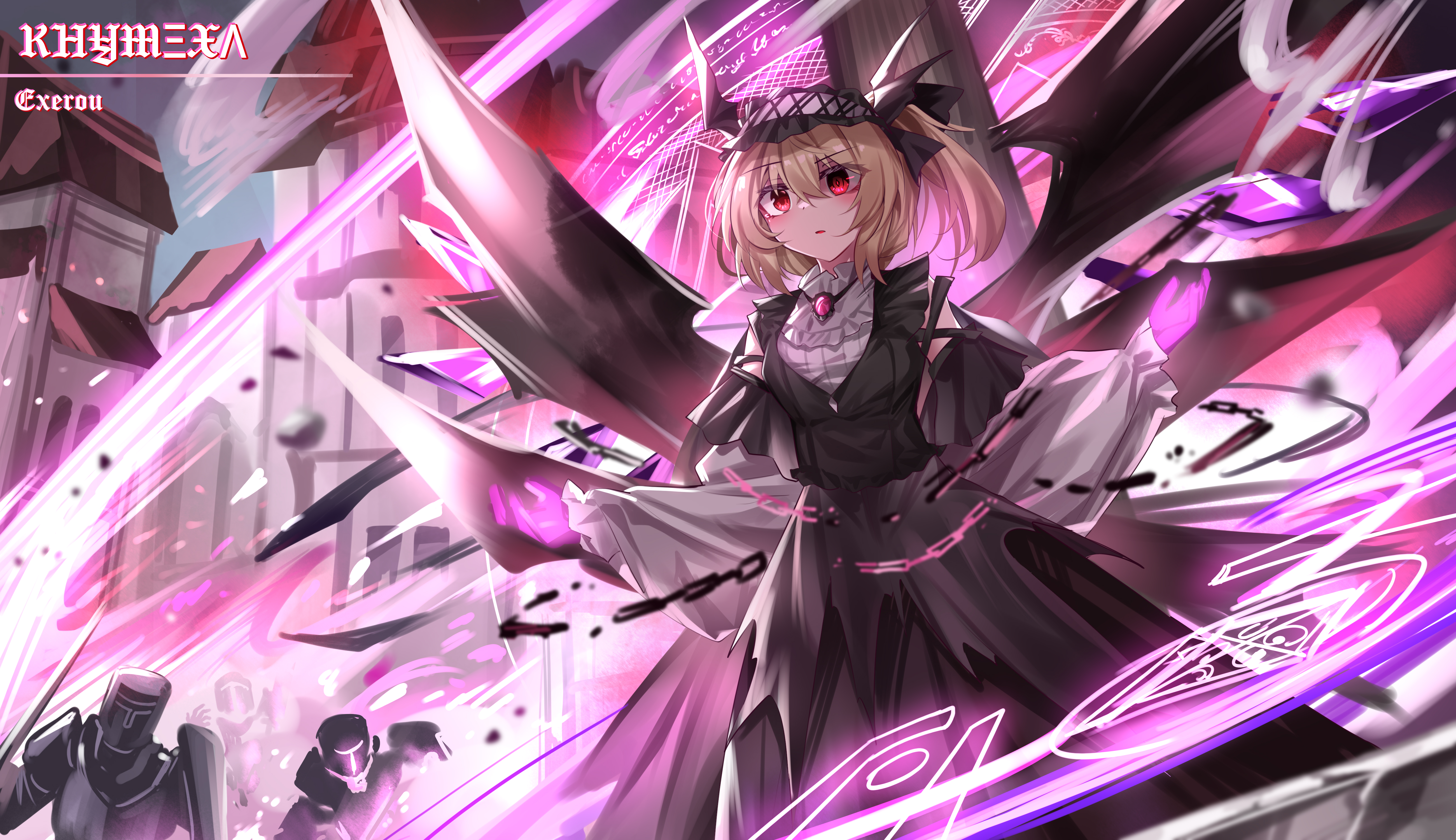 1girl absurdres alternate_costume armor black_dress blonde_hair bow crystal crystal_wings dress flandre_scarlet frills glowing hair_ribbon hat hat_ribbon highres holding knight long_sleeves looking_at_viewer magic maimai_(game) mob_cap outdoors parted_lips pink_eyes puffy_sleeves red_eyes ribbon short_hair side_ponytail sigil skirt smile solo standing top-exerou touhou wings