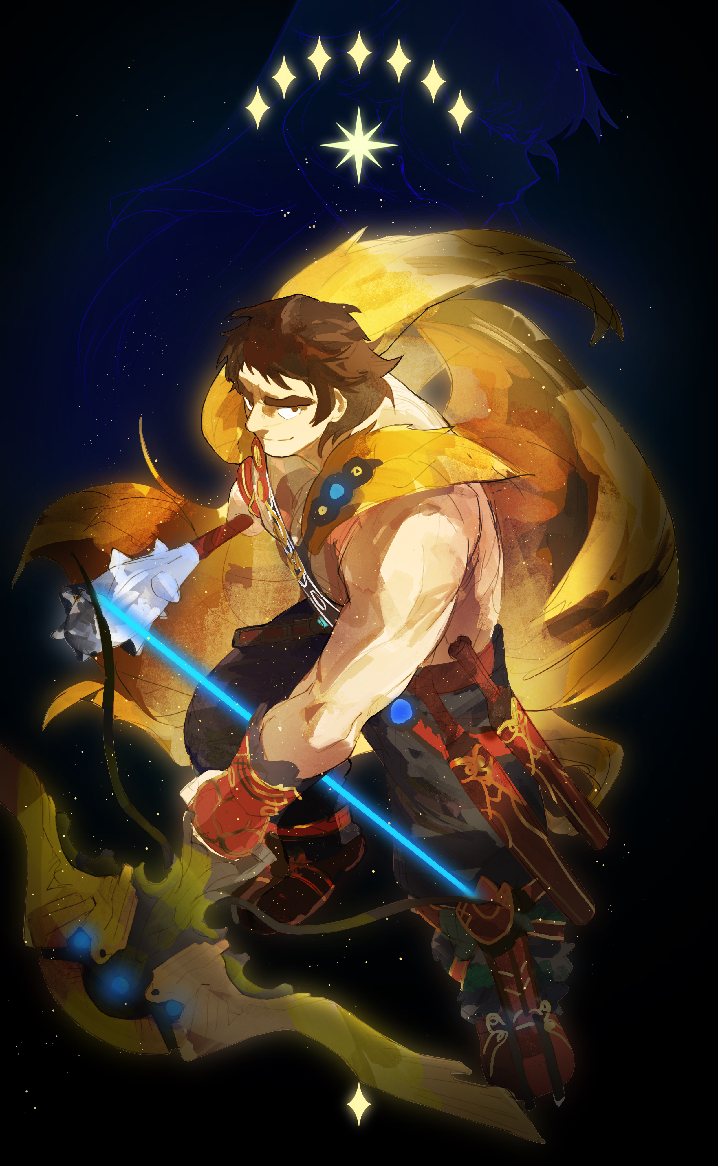 1boy abs absurdres arm_at_side armored_boots armored_gloves artemis_(fate) bara bare_pectorals belt belt_pouch big_nose black_pants blue_background boots bow_(weapon) brown_hair cape club club_(weapon) fate/grand_order fate_(series) fingerless_gloves fui_(fui29493452) full_body fur-trimmed_gloves fur_boots fur_trim gloves glowing highres holding holding_bow_(weapon) holding_club holding_weapon large_pectorals legs_apart light_particles looking_at_viewer male_focus medium_hair muscular muscular_male open_mouth pants pectorals pelt pouch sash sheath sheathed shoulder_sash smile solo sparkle spiked_club star_(symbol) super_orion_(fate) sword teeth thick_eyebrows topless_male veins weapon yellow_cape