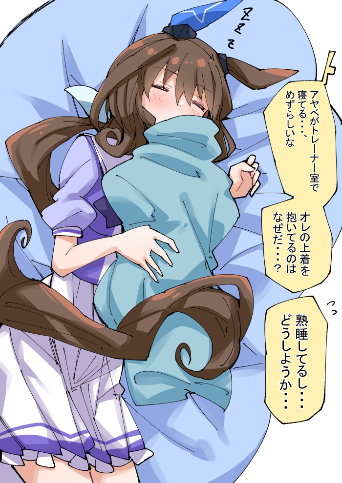 1girl admire_vega_(umamusume) animal_ears breasts brown_hair commentary_request ear_covers horse_ears horse_girl horse_tail medium_breasts nodachi_(nodati51) purple_shirt school_uniform shirt single_ear_cover sleeping solo_focus t-head_trainer_(umamusume) tail tracen_school_uniform trainer_(umamusume) translation_request umamusume zzz
