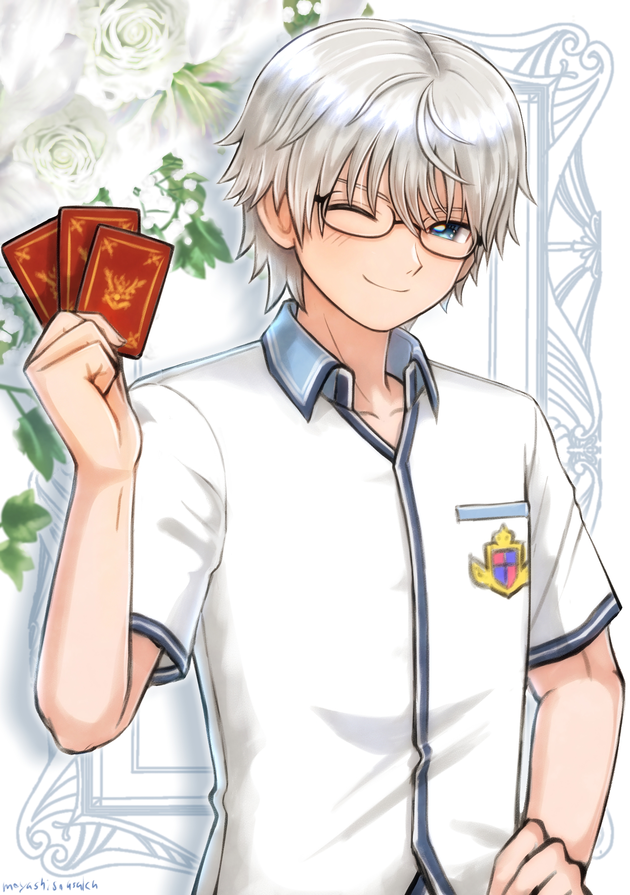 1boy absurdres asfeld_academy_school_uniform bespectacled black-framed_eyewear blue_eyes card commentary_request dragon_quest dragon_quest_x flower glasses hand_on_own_hip highres holding holding_card leaf looking_at_viewer male_focus miran_(dq10) moyapippi one_eye_closed rose school_uniform semi-rimless_eyewear shirt short_hair smile solo upper_body white_background white_flower white_hair white_rose white_shirt