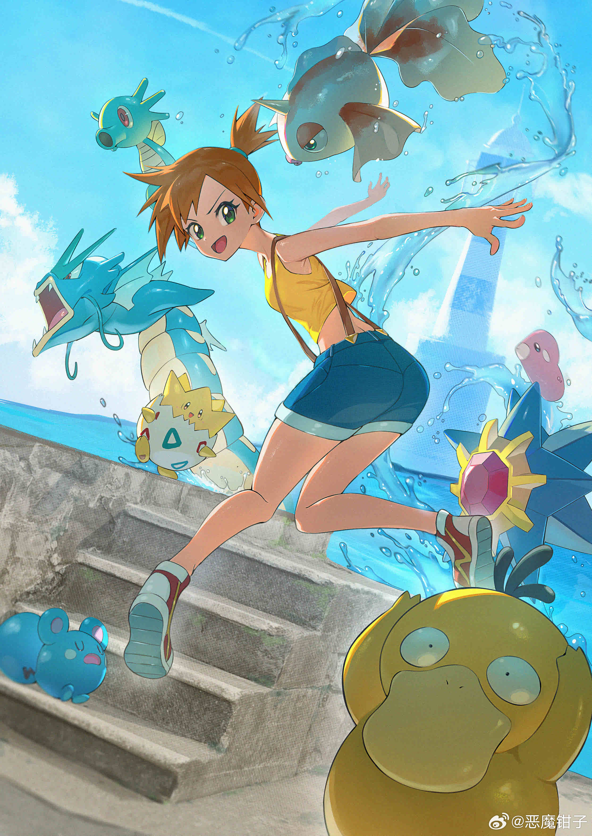 1girl :d absurdres ass asymmetrical_hair azurill breasts cloud day denim denim_shorts eyelashes gen_1_pokemon gen_2_pokemon gen_3_pokemon goldeen green_eyes gyarados gym_leader highres horsea huge_ass looking_at_viewer looking_back luvdisc misty_(pokemon) nintendo open_mouth orange_hair outdoors poke_ball pokemon pokemon_(anime) pokemon_(classic_anime) pokemon_rgby ponytail psyduck shirt shoes short_hair short_shorts shorts side_ponytail sky sleeveless sleeveless_shirt smile sneakers splashing stairs starmie suspenders tank_top togepi tongue water yellow_shirt yellow_tank_top
