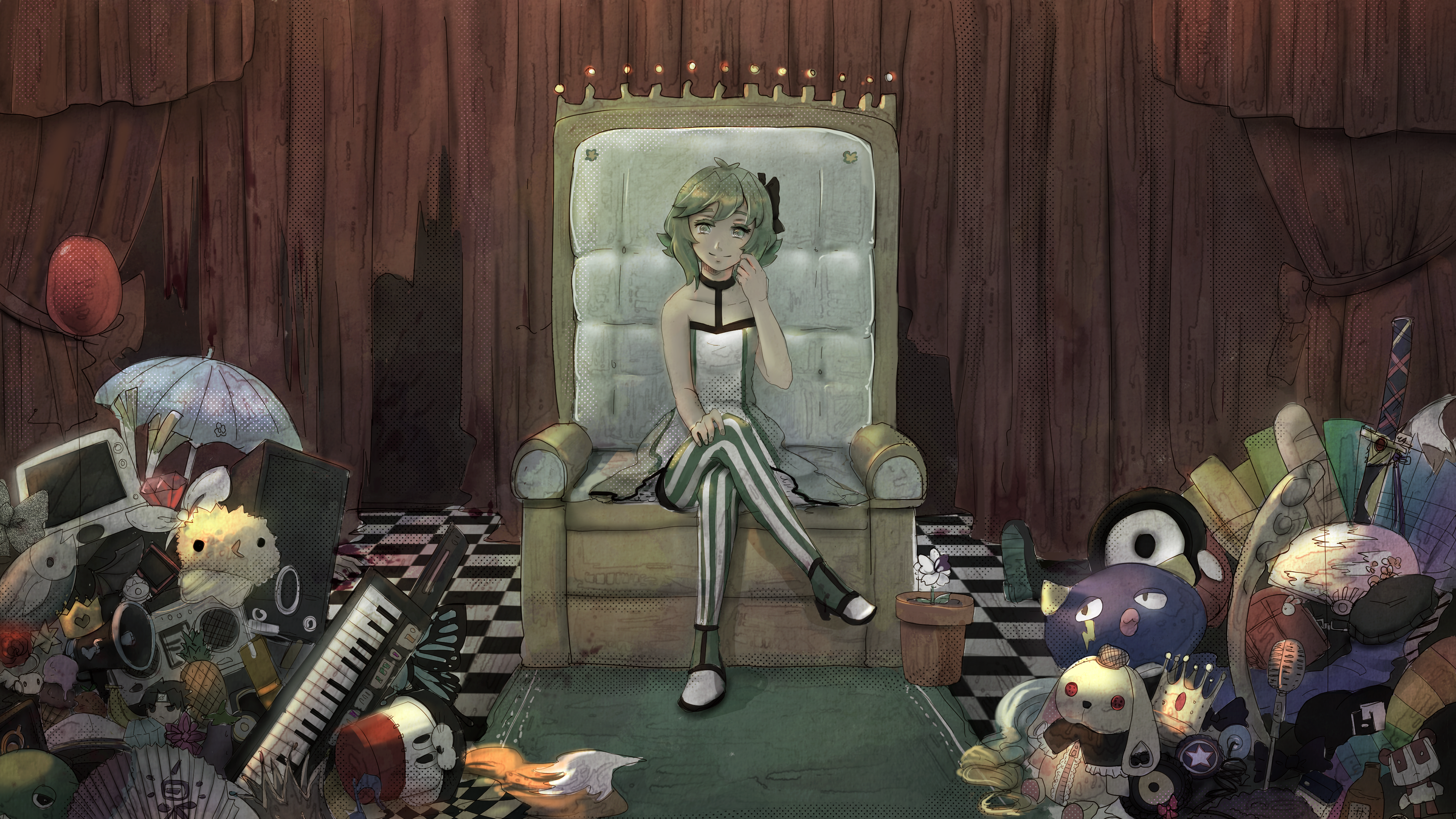 1girl absurdres baguette balloon bare_shoulders beer_bottle black_collar boombox bow bread collar computer crossed_legs crown curtains eggplant ekkoberry eyelashes fish flower flower_pot food fox_tail fruit gem green_eyes green_hair gumi hair_bow highres holding_own_leg ice_cream instrument katana keytar light_smile looking_at_viewer megaphone monster_(vocaloid) petite pineapple red_flower red_gemstone red_rose rose scabbard sheath solo spring_onion striped_clothes stuffed_animal stuffed_toy sword tail umbrella unworn_crown unworn_shoe vocaloid weapon