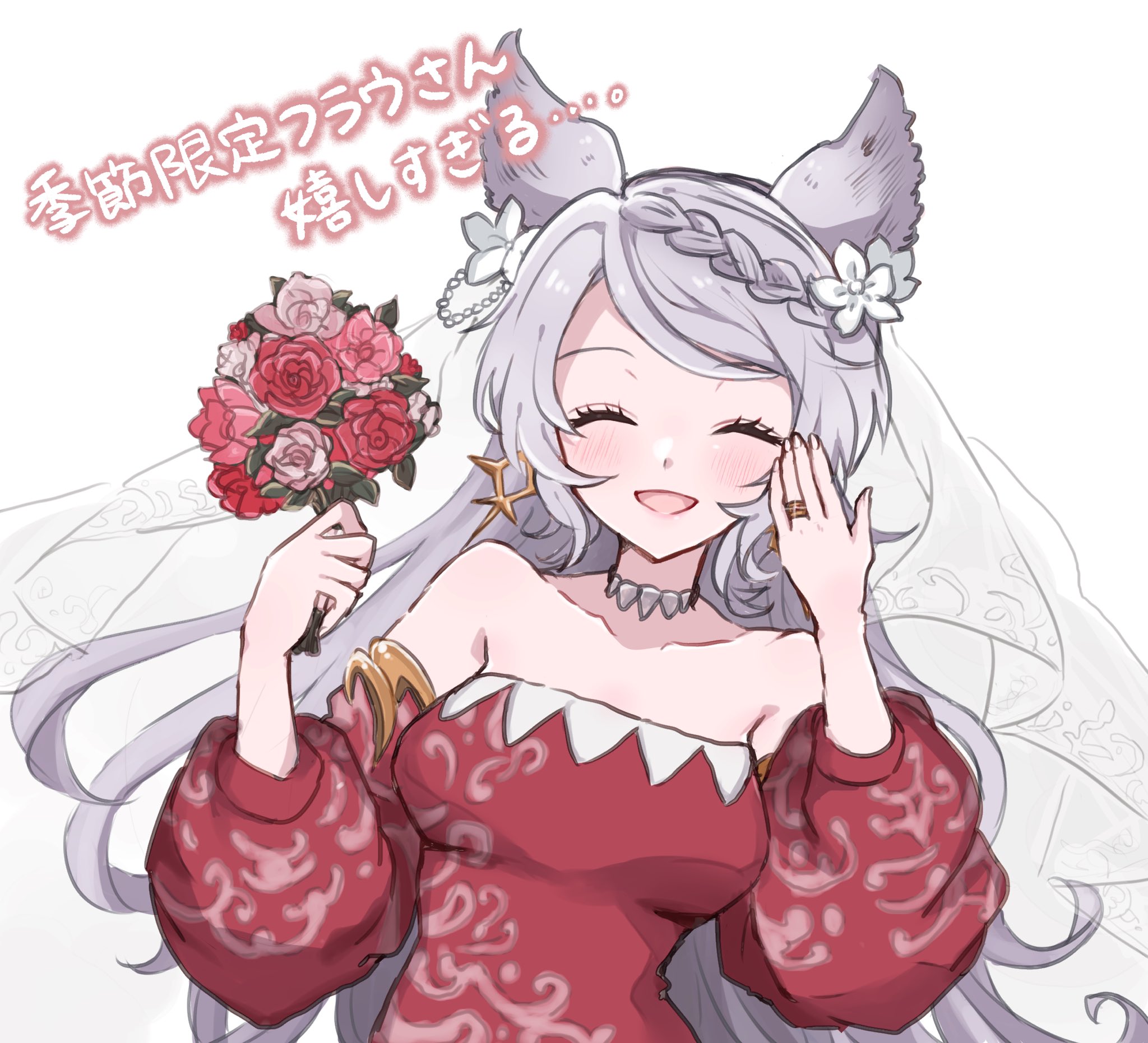 1girl animal_ears bare_shoulders blush braid breasts bridal_veil chagame collarbone dress erune flower fraux fraux_(formal)_(granblue_fantasy) granblue_fantasy grey_hair hair_flower hair_ornament highres jewelry long_hair medium_breasts open_mouth ring smile solo upper_body veil very_long_hair wedding_dress wedding_ring