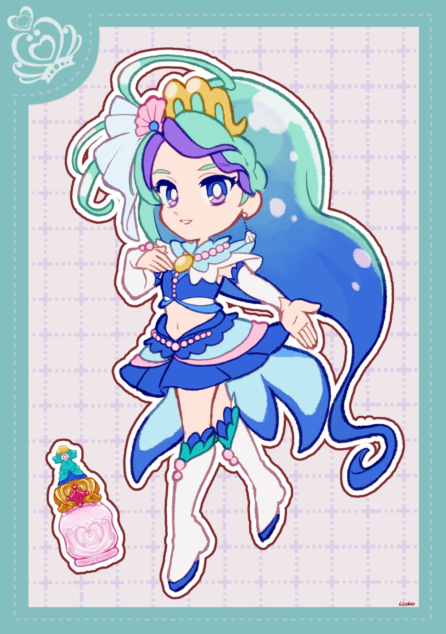 1girl absurdly_long_hair aqua_border aqua_hair blue_collar blue_eyes blue_hair blue_ribbon blue_shirt blue_skirt blue_socks boots border bottle braid bridal_gauntlets bright_pupils brooch collar crop_top cure_mermaid deformed detached_collar dot_nose dotted_line earrings eyelashes floating full_body go!_princess_precure gold_tiara gradient_hair grey_background grid_background hair_ornament hair_ribbon hand_on_own_chest happy high_heel_boots high_heels highres jewelry kaidou_minami knee_boots kneehighs long_hair looking_at_viewer magical_girl midriff miniskirt multicolored_hair navel necklace open_mouth outline outstretched_hand pearl_necklace perfume_bottle pleated_skirt precure purple_hair ribbon shell shell_earrings shell_hair_ornament shirt short_sleeves signature single_braid skirt smile socks solo streaked_hair tiara train_(clothing) uwded_207 very_long_hair wavy_hair white_boots white_bridal_gauntlets white_outline white_pupils white_sleeves