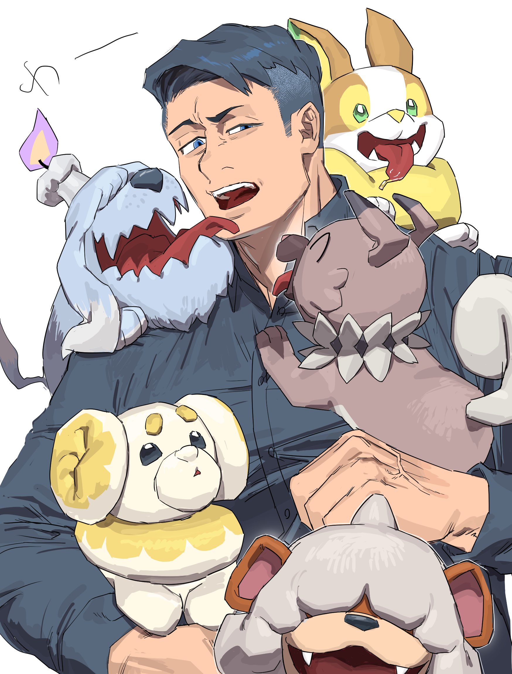 1boy blue_eyes blue_hair blue_shirt closed_eyes collared_shirt commentary_request crossover dog fidough fire furrowed_brow gen_1_pokemon gen_7_pokemon gen_8_pokemon greavard growlithe half-closed_eye highres holding holding_pokemon long_sleeves looking_at_viewer male_focus matsuda_ryota nintendo on_shoulder open_mouth pokemon pokemon_(creature) pokemon_on_shoulder purple_fire rockruff shirt short_hair simple_background smile tongue tongue_out toshi_densetsu_kaitai_center trait_connection translation_request upper_body white_background yamper yochiyochi