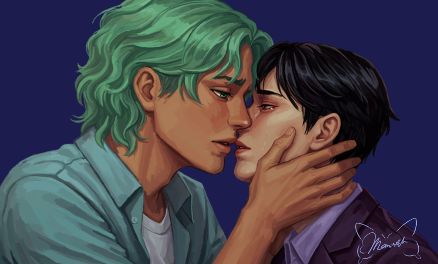 2boys baxter_ward black_hair blue_coat brown_eyes coat collared_shirt cove_holden crying crying_with_eyes_open green_eyes green_hair hand_on_another's_face hand_on_another's_head imminent_kiss looking_at_another male_focus mole mole_on_neck monarch_chimera multiple_boys open_mouth our_life our_life:_beginnings_and_always parted_lips portrait purple_coat purple_shirt shirt short_hair sideburns tears wavy_hair white_shirt yaoi