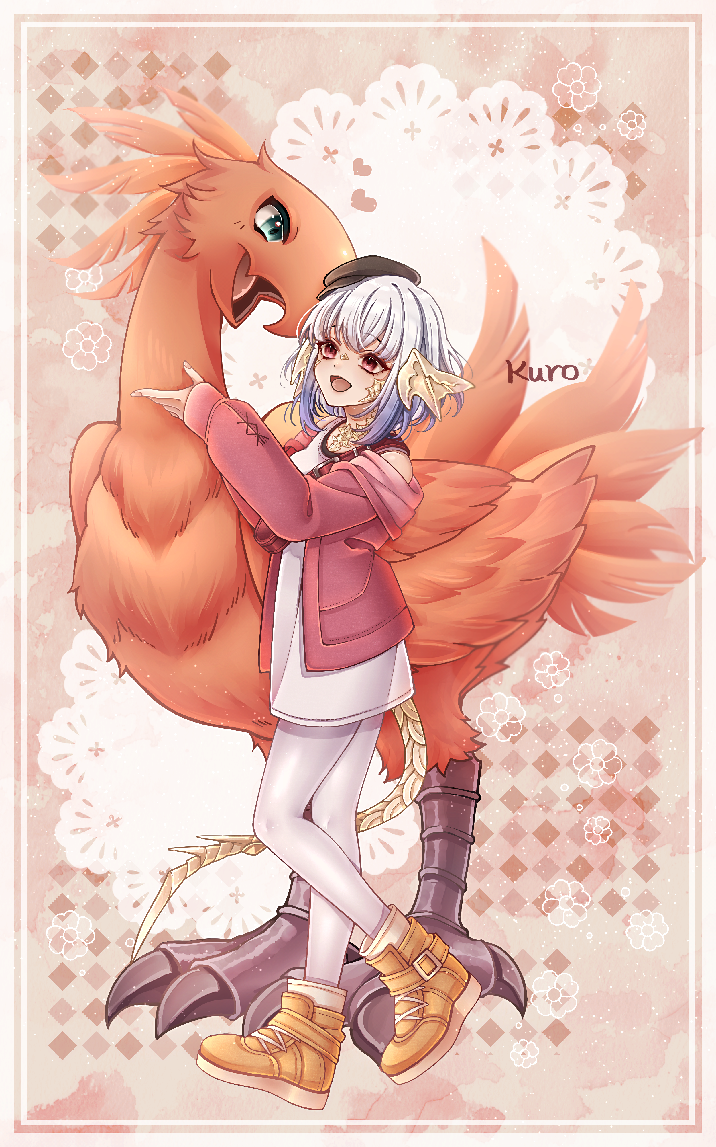 1girl 1other :d absurdres aqua_eyes au_ra bird black_hat commentary_request commission creature_request final_fantasy final_fantasy_xiv hat heart highres horns jacket kuro11_222 leggings looking_at_another looking_up open_mouth orange_background orange_feathers orange_shoes partial_commentary pink_eyes pink_jacket red_background shoes skeb_commission smile tail tank_top warrior_of_light_(ff14) white_hair white_leggings white_tank_top