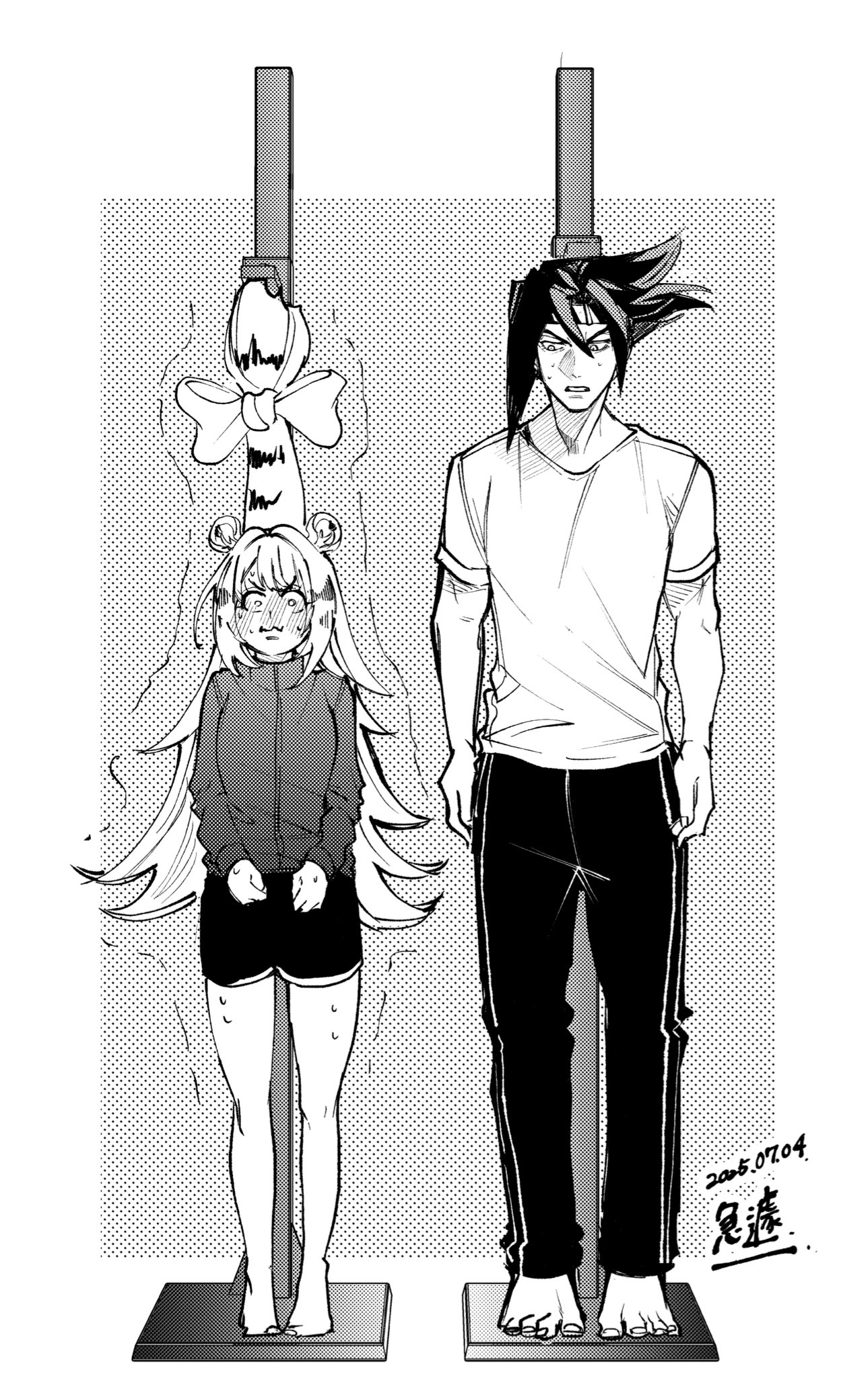 1boy 1girl animal_ears anton_ivanov arms_at_sides aruaruhizen117 blush bow cheating_(competitive) closed_mouth dated full_body gym_shorts headband height_conscious height_difference highres jacket ju_fufu long_hair long_sleeves looking_at_another measuring medium_hair multicolored_hair nose_blush open_mouth pants shirt short_sleeves shorts straight-on sweat tail tail_bow tail_ornament tiger_ears tiger_girl tiger_tail tiptoes toes track_pants trembling v-shaped_eyebrows very_long_hair very_long_tail zenless_zone_zero