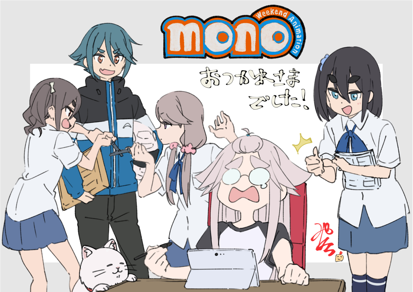 5girls ^^^ akiyama_haruno amamiya_satsuki_(mono) bangs_pinned_back black_hair black_jacket black_pants blue_eyes blue_hair blue_jacket blue_ribbon blue_skirt blue_socks border bow cat collared_shirt commentary copyright_logo drawing_tablet fangs fencing glasses grey_border grey_hair hair_bow hair_flaps hair_ornament hair_over_shoulder hair_scrunchie helmet highres holding holding_paper holding_stylus holding_unworn_helmet improvised_weapon jacket kiriyama_an komada_kako logo low_twintails miyahara_takuya mono_(afro) multicolored_jacket multiple_girls neck_ribbon one_side_up opaque_glasses orange_eyes pants paper pink_scrunchie raglan_sleeves ribbon ruler school_uniform scrunchie shikishima_sakurako shirt short_hair short_sleeves signature skin_fangs skirt socks stylus swept_bangs t-shirt table taishou_(mono) tearing_up thick_eyebrows thumbs_up translation_request twintails unworn_headwear unworn_helmet white_background white_bow white_cat white_hair white_jacket white_shirt