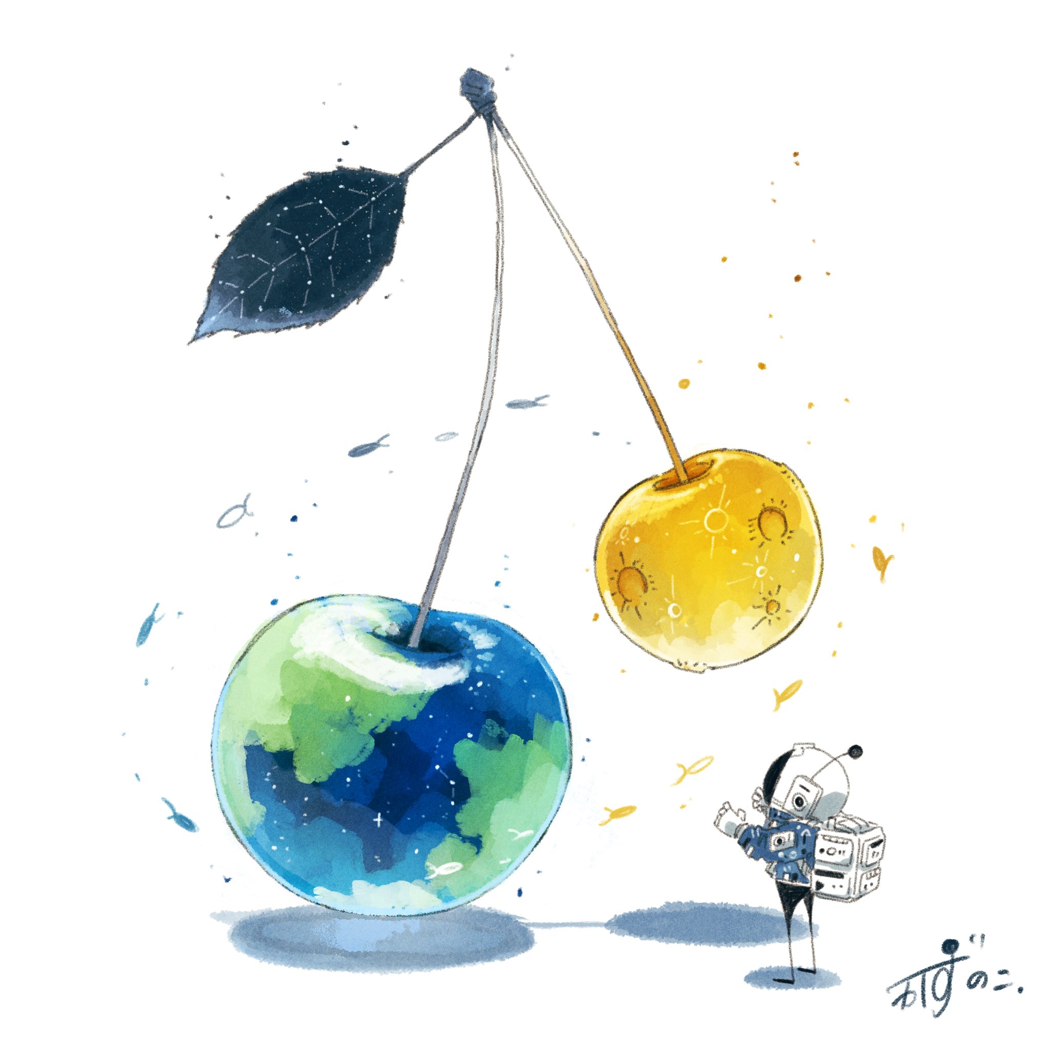 1other artist_name backpack bag blue_jacket cherry commentary crater earth_(planet) fish floating flying_fish food food_focus fruit gloves hands_up helmet highres jacket kazunoko_(kazunoko_zunoco) leaf looking_at_food moon original planet radio_antenna shadow signature simple_background solo space_helmet standing white_background white_gloves