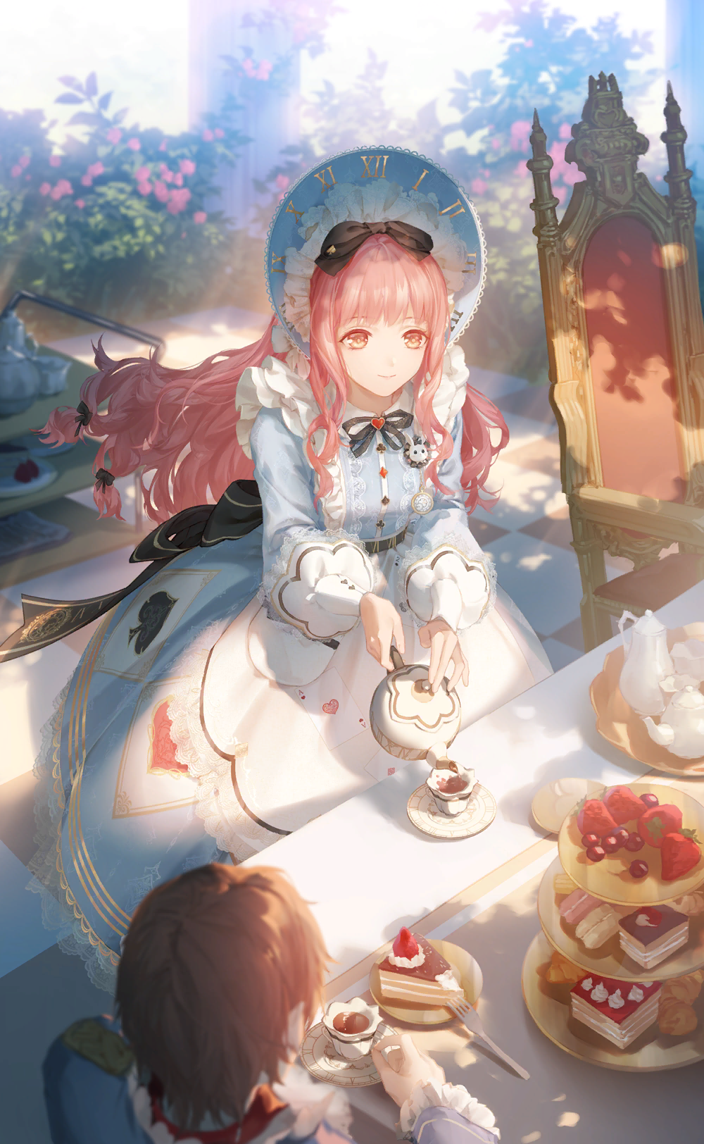 1boy 1girl ace_(playing_card) ace_of_hearts ace_of_spades alice's_teaspoon_(shining_nikki) apron artist_request black_bow black_ribbon blue_bonnet blue_coat blue_dress blueberry bonnet bow brown_eyes brown_hair bush buttons cake cake_slice card chair checkered_floor classic_lolita clock_print closed_mouth coat collar collared_coat cup day dot_nose dress flower food fork formal_clothes frilled_apron frilled_collar frilled_headwear frilled_sleeves frills fruit game_cg hair_bow happy heart highres holding holding_cup holding_teapot lace lace-trimmed_dress lace_trim lolita_fashion long_dress long_sleeves looking_ahead multicolored_buttons multiple_hair_bows neck_ribbon nikki_(nikki) nikki_(series) official_art outdoors pink_flower pink_rose plate playing_card playing_card_print pleated_dress pouring puffy_long_sleeves puffy_sleeves ribbon rose rose_bush saucer shade shining_nikki short_hair sidelocks smile solo_focus spade_(shape) standing strawberry tea tea_party teacup teapot wavy_hair white_apron