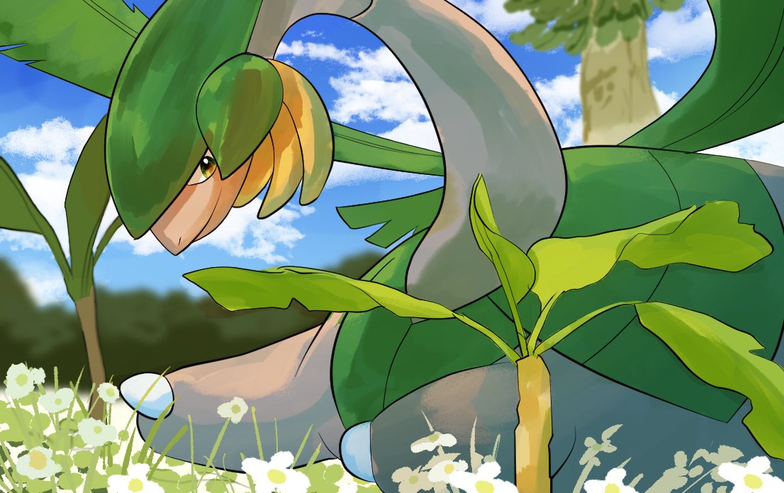 banana blue_sky closed_mouth cloud commentary flower food fruit gen_3_pokemon grass green_eyes inudomooo leaf nintendo one-hour_drawing_challenge outdoors palm_tree pokemon pokemon_(creature) sapling sitting sky smile solo tree tropius white_flower