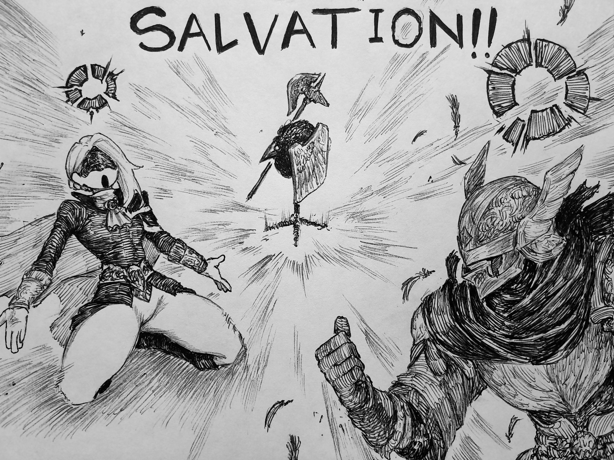 1girl 2boys :o ascot asymmetrical_bangs blindfold blindfold_mask boots chronozbergh clenched_hand cloak dramatic_dmitry_(meme) duchess_(elden_ring) elden_ring elden_ring_nightreign emphasis_lines english_text gameplay_mechanics gloves greyscale guardian_(elden_ring) helmet highres holding holding_polearm holding_weapon knee_boots kneeling mask meme monochrome multiple_boys outstretched_arms pants polearm pukeko shield short_hair spread_arms weapon white_ascot white_gloves white_pants winged_helmet wylder_(elden_ring)