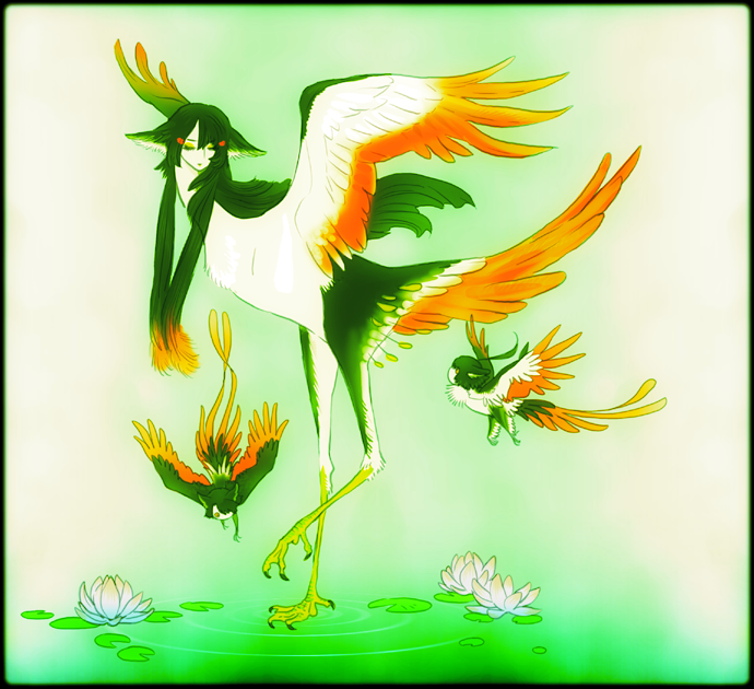 1girl 2others animal_ears bird bird_legs child closed_eyes closed_mouth expressionless feathered_wings feathers flying green_feathers green_hair harpy human_head isaki_(shimesaba) kalavinka lily_pad long_hair monster_girl multicolored_feathers multicolored_hair multiple_others orange_feathers orange_hair orange_tail orange_wings original size_difference solo white_feathers white_wings wings