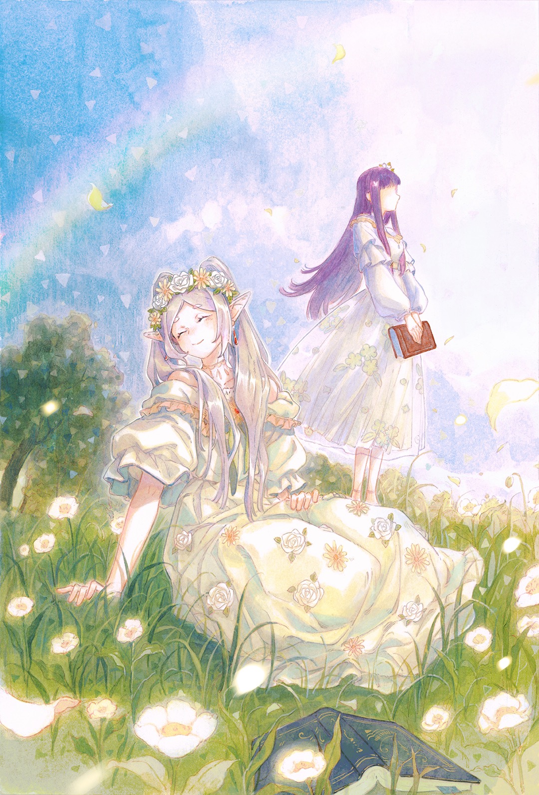 2girls 9484gu book breasts chinese_commentary closed_eyes closed_mouth collarbone commentary_request day dress dress_flower elf fern_(sousou_no_frieren) flower frieren grass green_dress hand_on_ground hand_on_own_thigh head_wreath highres holding holding_book long_dress long_hair long_sleeves multiple_girls off_shoulder on_grass open_book outdoors parted_bangs pointy_ears puffy_short_sleeves puffy_sleeves purple_hair rainbow sapling short_sleeves sitting smile sousou_no_frieren standing strapless strapless_dress teardrop traditional_media white_dress white_flower yokozuwari
