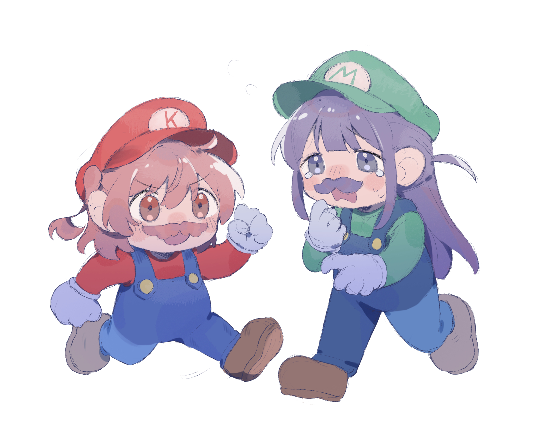 2girls aijou_karen blue_overalls blunt_bangs blush_stickers brown_eyes brown_hair brown_shoes buttons chinese_commentary commentary_request cosplay crossdressing crossdressing_(ftm) deformed fake_facial_hair fake_mustache gloves green_hat green_shirt grey_gloves hair_between_eyes hand_up hat highres long_hair looking_ahead luigi luigi_(cosplay) mario mario_(cosplay) mario_(series) multiple_girls nervous_sweating newsboy_cap nintendo one_side_up open_mouth overalls peanut_mouth red_hat red_shirt rei931218 shirt shoes short_hair shoujo_kageki_revue_starlight sidelocks simple_background sweat tearing_up tsuyuzaki_mahiru walking white_background