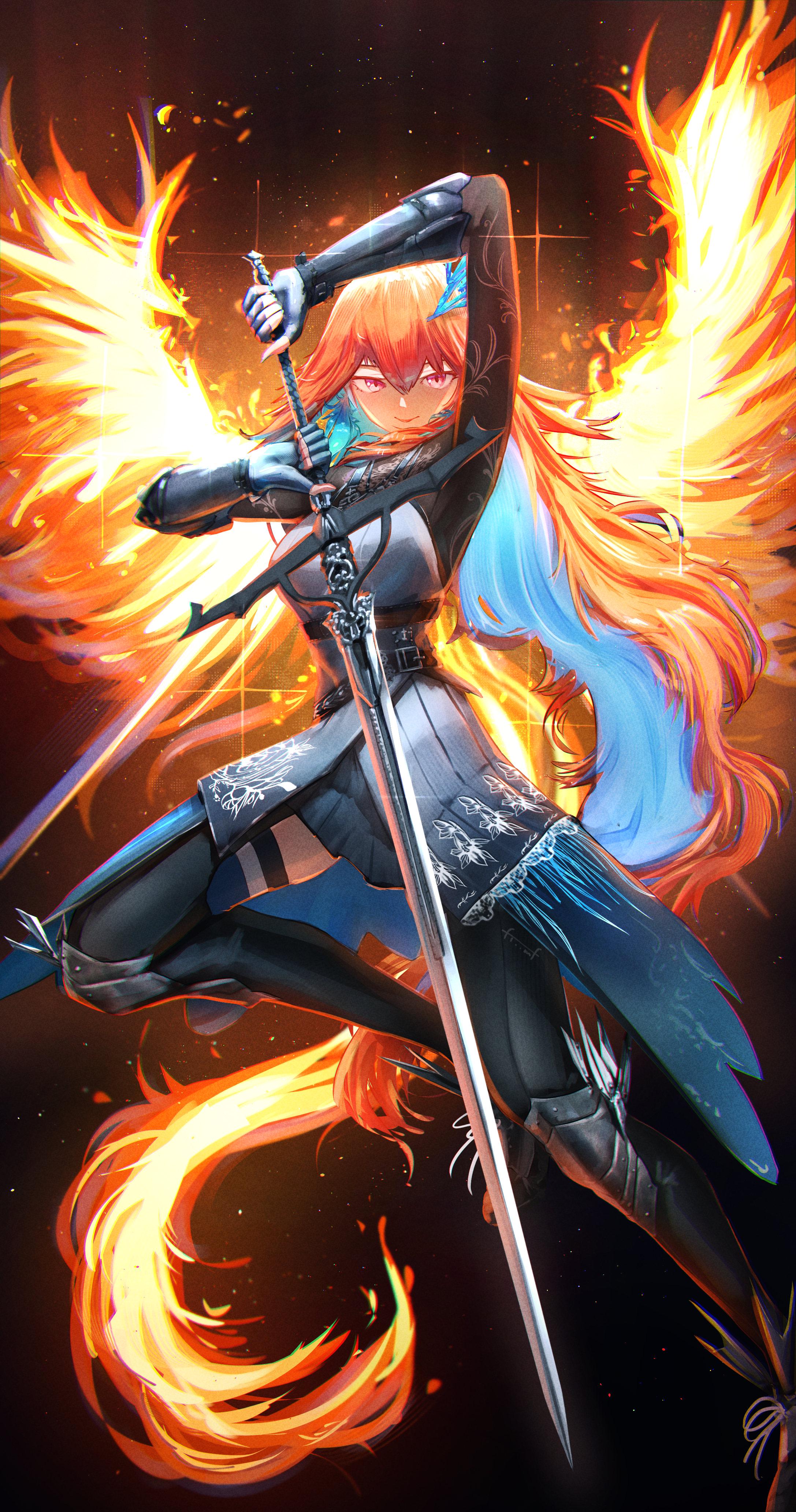 1girl absurdres aqua_nails armor blue_hair breastplate colored_inner_hair commission earrings feather_earrings feathers fingerless_gloves floomf gauntlets gloves greatsword greaves hair_ornament highres holding holding_sword holding_weapon hololive hololive_english jewelry long_hair looking_at_viewer multicolored_hair orange_hair phoenix_wings pink_eyes second-party_source skirt solo sword takanashi_kiara takanashi_kiara_(knight) vambraces very_long_hair virtual_youtuber weapon