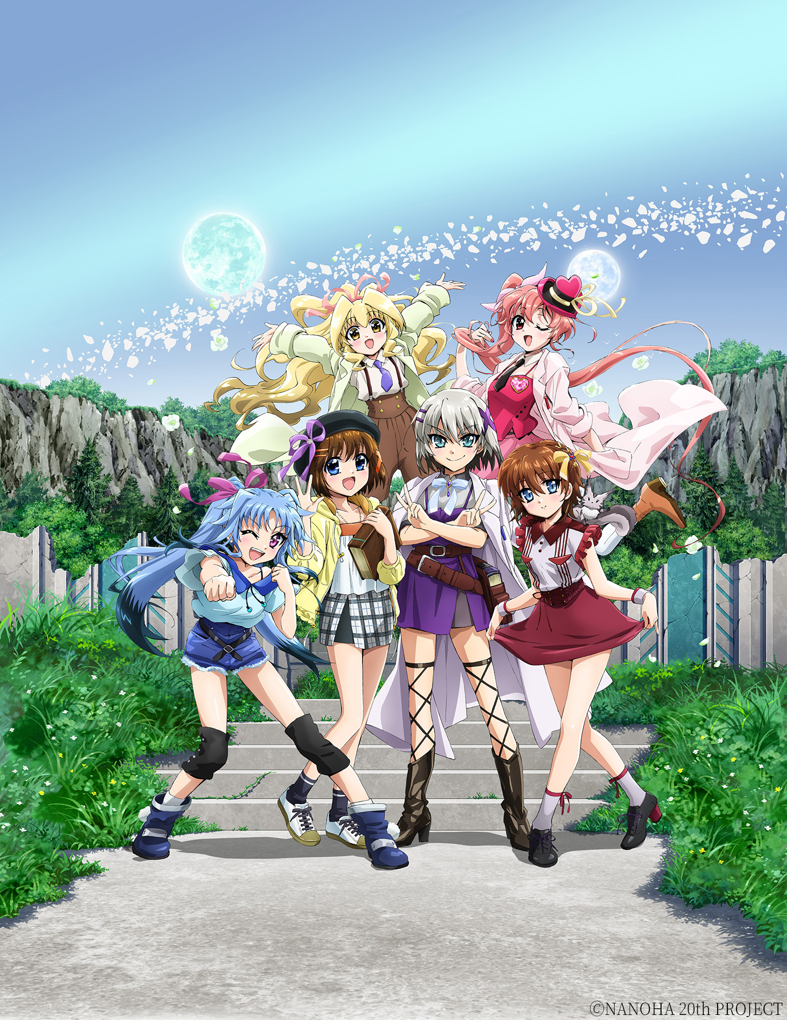 6+girls \o/ animal animal_on_shoulder arms_up artist_request blue_sky book boots casual clenched_hand closed_mouth crossed_arms crossed_belts day double_v grass hair_ornament hat highres holding holding_book iris_(nanoha) jacket levi_the_slasher lord_dearche lyrical_nanoha mahou_shoujo_lyrical_nanoha_detonation moon_in_daylight multiple_girls multiple_moons official_art one_eye_closed open_clothes open_hand open_jacket open_mouth outdoors outstretched_arms short_shorts shorts skirt skirt_hold sky smile stairs standing stern_the_destructor tome_of_the_night_sky v x_hair_ornament yagami_hayate yuri_eberwein