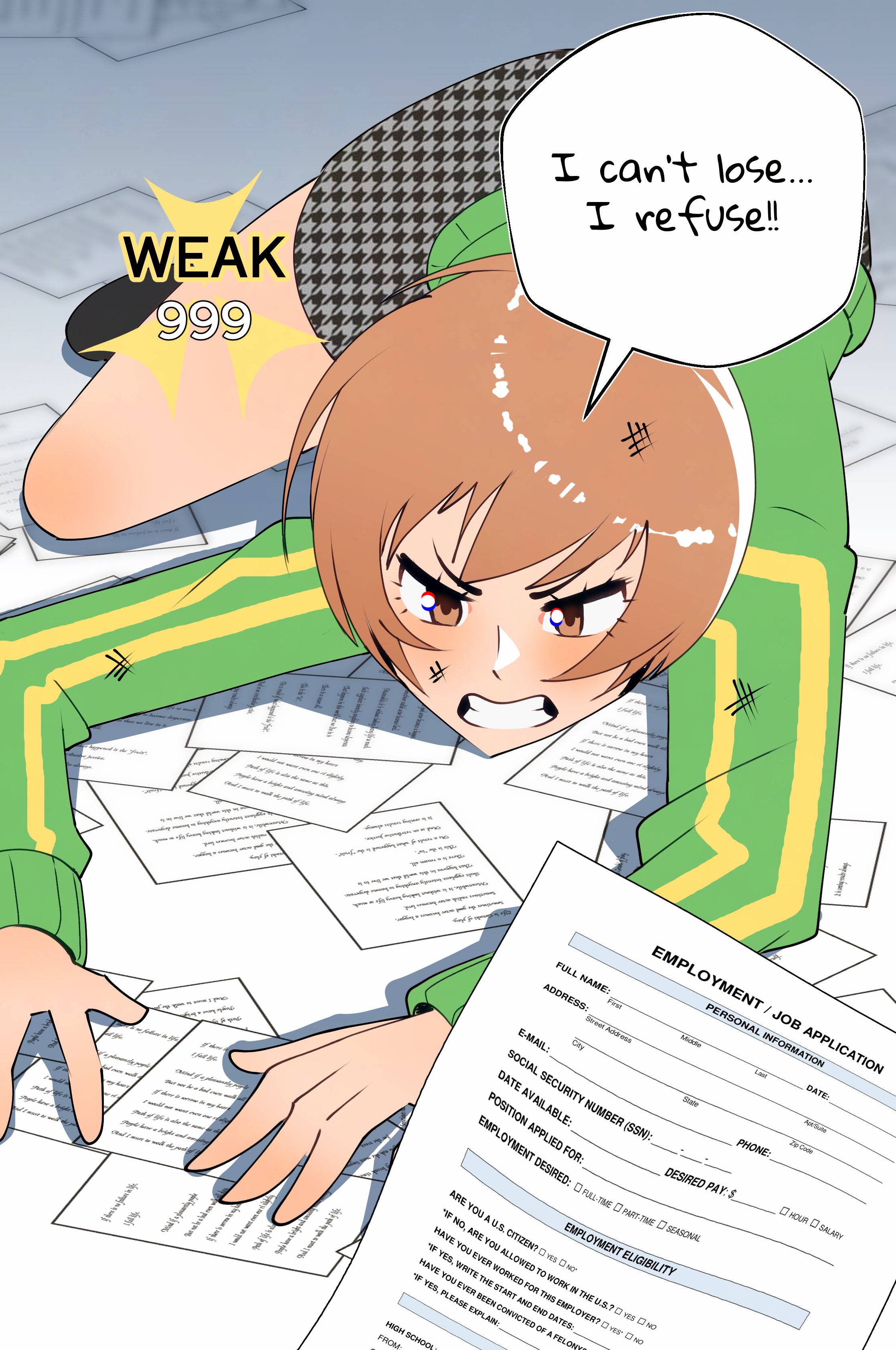 1girl absurdres black_shoes brown_eyes brown_hair bruise clenched_teeth commentary english_commentary english_text gjh green_jacket highres houndstooth injury jacket job_application_form_(meme) light_blush meme on_floor papers peril persona persona_4 satonaka_chie school_uniform shoes short_hair skirt solo speech_bubble teeth track_jacket v-shaped_eyebrows