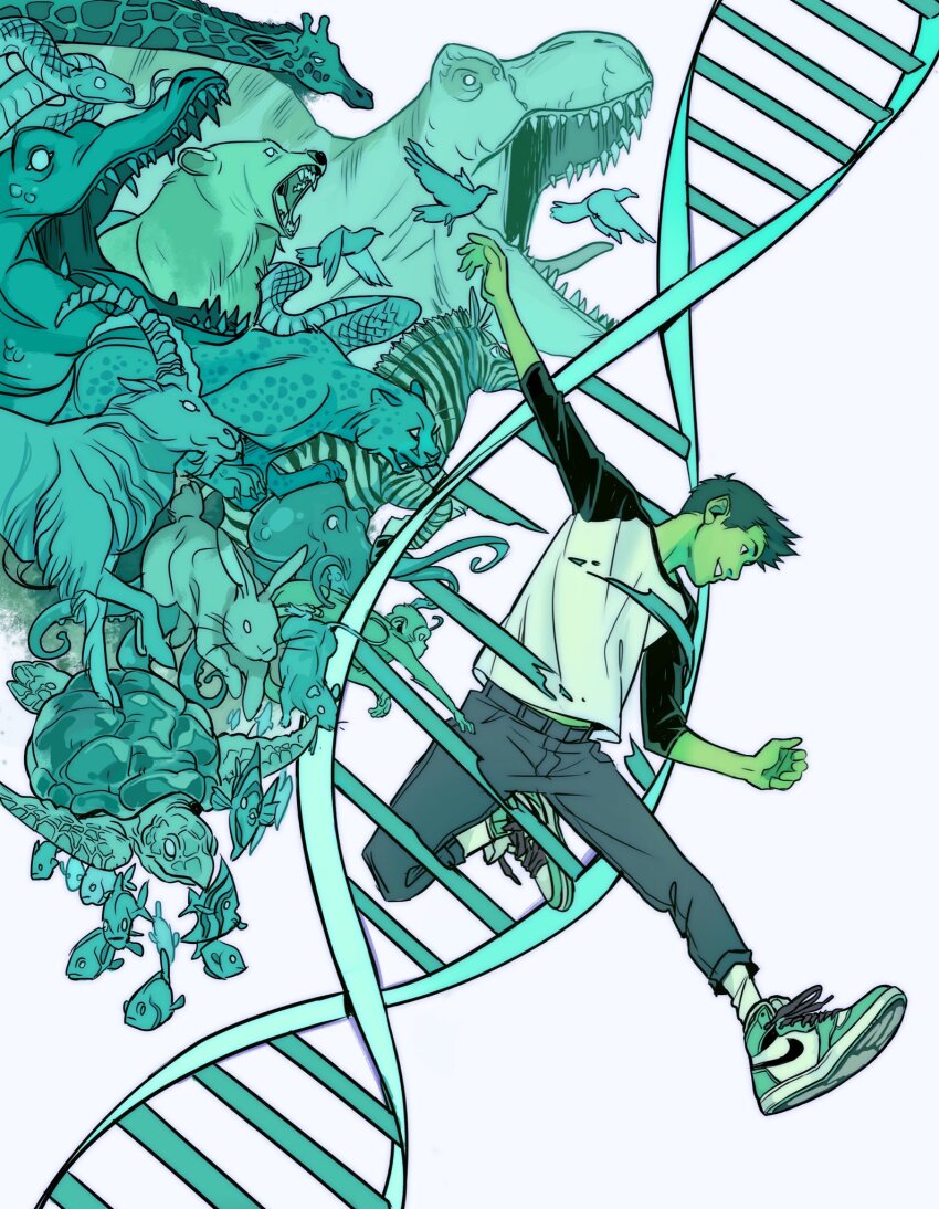 1boy animal bear beast_boy_(dc) bird black_dress colored_skin dc_comics dinosaur dna dress fish gabriel_picolo gabriel_picolo_(artist) giraffe goat green_hair green_skin hair_ornament happy jaguar monkey mouse multiple_animals octopus pointy_ears rabbit smile snake teen_titans turtle zebra