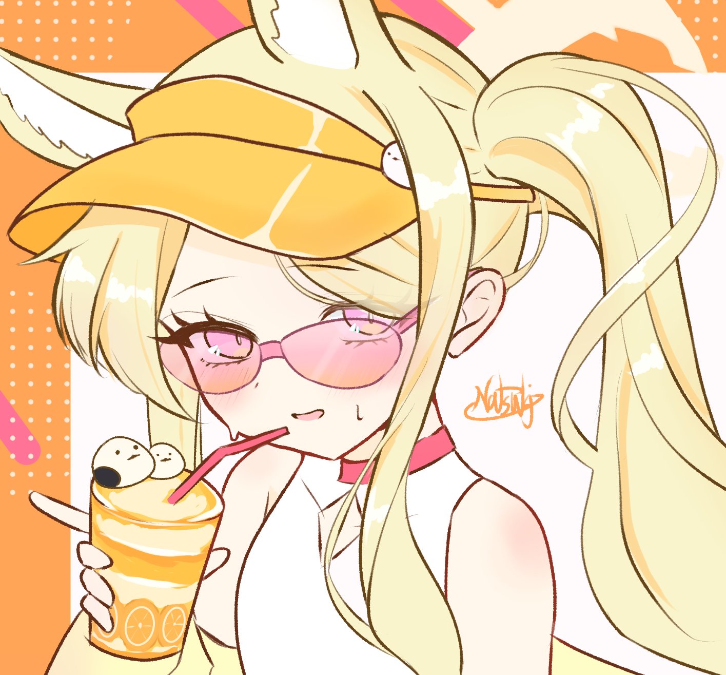 1girl animal_ear_fluff animal_ears bare_shoulders blonde_hair blue_archive blush breasts choker clothing_cutout commentary_request cross_halo cup diamond_cutout drinking_straw fox_ears fox_girl gradient_eyes halo highres holding holding_cup juice long_hair looking_at_viewer multicolored_eyes official_alternate_costume one-piece_swimsuit open_mouth orange-tinted_eyewear orange_background orange_juice red_choker seia_(blue_archive) seia_(swimsuit)_(blue_archive) side_ponytail signature small_breasts smile solo sunglasses sweatdrop swimsuit tanabata_natsuki tinted_eyewear two-tone_background unfinished upper_body visor_cap white_background white_one-piece_swimsuit yellow_halo yellow_visor