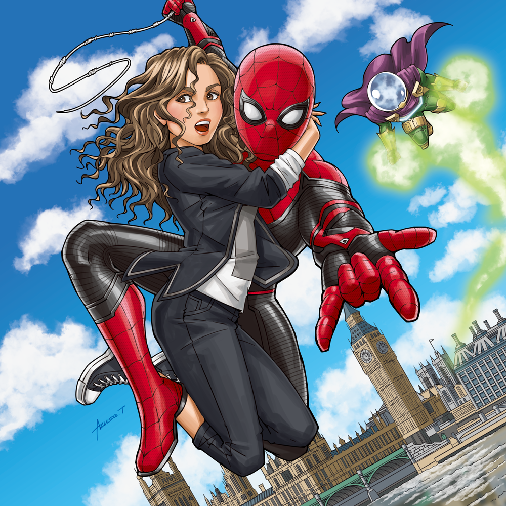 1girl 2boys :o \m/ arm_around_shoulder arm_up armor artist_name azusa_tanaka black_bodysuit black_jacket black_pants black_shoes blue_sky blush bodysuit boots bracer brown_eyes brown_hair building canal cape capri_pants carrying carrying_person cloud cloudy_sky commentary couple dark-skinned_female dark_skin day dutch_angle elizabeth_tower england european_architecture fishbowl_helmet flag flying full_body gold_armor gold_boots green_bodysuit hair_between_eyes helmet jacket knee_up lips london long_hair looking_at_viewer looking_to_the_side marvel marvel mask michelle_"mj"_jones midair mixed-language_commentary multicolored_bodysuit multiple_boys mysterio open_clothes open_jacket open_mouth outdoors outstretched_arm pants print_bodysuit purple_cape red_bodysuit shirt shoes signature silk skin_tight sky sleeves_rolled_up sneakers spider-man spider-man:_far_from_home spider-man_(series) spider_web spider_web_print superhero_costume teeth thames toned toned_male tower two-tone_bodysuit upper_teeth_only wavy_hair westminster_bridge westminster_palace white_shirt