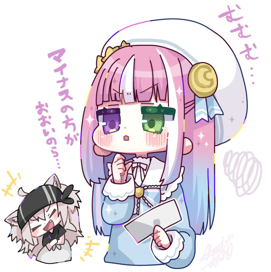 2girls beret blue_bow blue_bowtie blue_hair blue_jacket blush_stickers bow bowtie chibi chibi_only commentary_request frilled_sailor_collar frills gradient_hair green_eyes hat heterochromia himemori_luna himemori_luna_(7th_costume) hololive jacket jitome long_hair long_sleeves multicolored_hair multiple_girls official_alternate_costume official_alternate_hairstyle pink_hair purple_eyes purple_hair sailor_collar satsuki_atan shirt shishiro_botan sleeve_cuffs solo_focus straight_hair streaked_hair translation_request virtual_youtuber white_hat white_sailor_collar white_shirt white_streaks