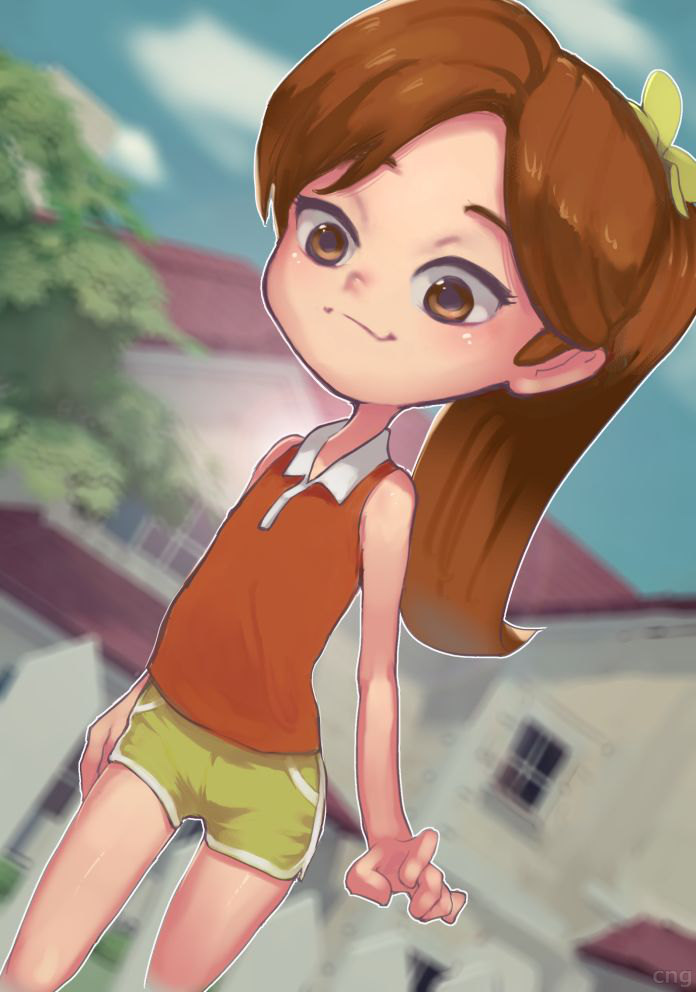 1girl blush brown_eyes brown_hair cloud conoghi green_ribbon green_shorts hair_ribbon house in_a_heartbeat long_hair looking_at_viewer ponytail red_shirt ribbon shirt shorts sky sleeveless sleeveless_shirt smile sunny_(in_a_heartbeat) tree walking