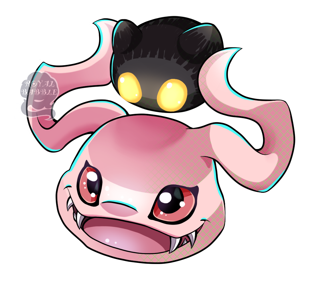 artist_name black_skin botamon colored_skin digimon digimon_(creature) fangs koromon looking_at_viewer open_mouth pink_skin royalbabble simple_background transparent_background watermark yellow_eyes