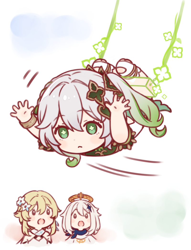 3girls :o acrobatics blonde_hair bracelet chibi commentary_request cross-shaped_pupils genshin_impact gradient_hair green_eyes green_hair hair_between_eyes haruneharu jewelry long_hair looking_at_viewer lumine_(genshin_impact) multicolored_hair multiple_girls nahida_(genshin_impact) on_swing open_mouth paimon_(genshin_impact) short_hair side_ponytail sidelocks swing swinging_on_swing symbol-shaped_pupils upside-down white_background white_hair
