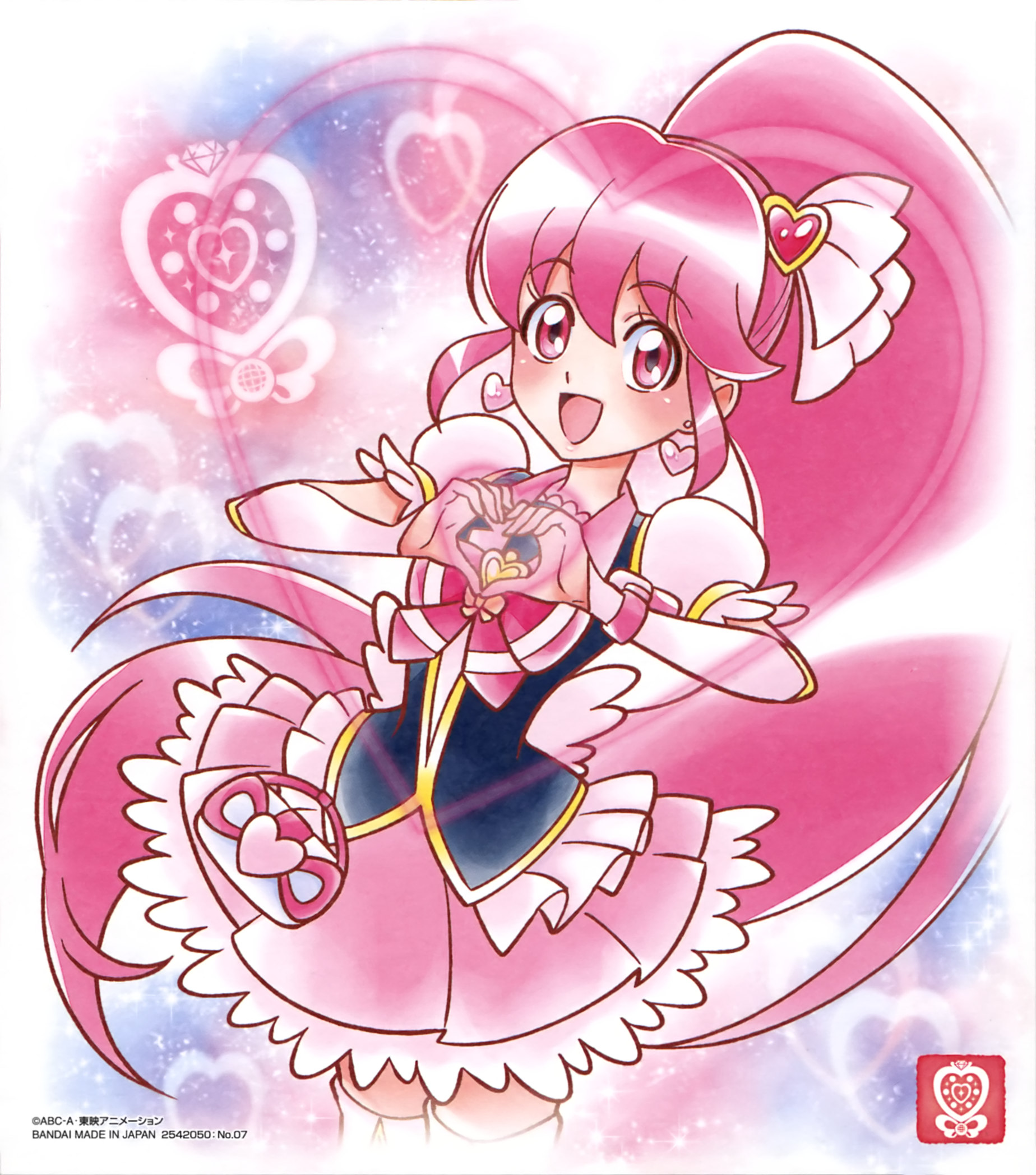 1girl aino_megumi artist_request back_bow black_vest blue_background border bow bowtie brooch collared_vest copyright_notice cowboy_shot cure_lovely dot_nose earrings frilled_shirt frilled_sleeves frills hair_between_eyes hair_ornament hair_ribbon happinesscharge_precure! happy heart heart_brooch heart_earrings heart_hair_ornament heart_hands highres jewelry lace lace-trimmed_shirt lace-trimmed_skirt lace_trim lapels light_blush light_particles long_hair magical_girl miniskirt official_art open_mouth pink_background pink_bow pink_bowtie pink_eyes pink_hair pink_skirt pleated_skirt ponytail precure puffy_short_sleeves puffy_sleeves ribbon shirt short_sleeves skirt smile solo standing tareme thighhighs third-party_source two-tone_background very_long_hair vest waist_bag watch white_arm_warmers white_bag white_border white_ribbon white_shirt white_thighhighs wristwatch