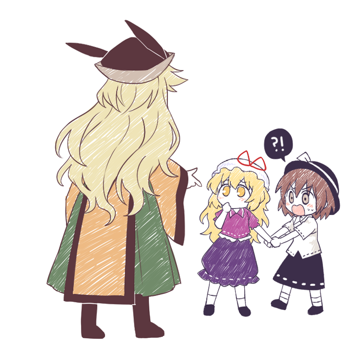 !? 3girls aged_down black_hat black_shoes black_skirt blonde_hair boots brown_hat child commentary_request detached_sleeves fedora green_skirt hand_grab hat hat_ribbon long_hair maribel_hearn matara_okina mob_cap multiple_girls orange_sleeves orange_tabard purple_shirt purple_skirt re_ghotion red_ribbon ribbon ribbon-trimmed_shirt ribbon-trimmed_skirt ribbon-trimmed_sleeves ribbon_trim shirt shoes short_sleeves skirt socks spoken_interrobang tabard taboo_japan_disentanglement touhou usami_renko very_long_hair white_ribbon white_shirt white_socks wide_sleeves yellow_eyes