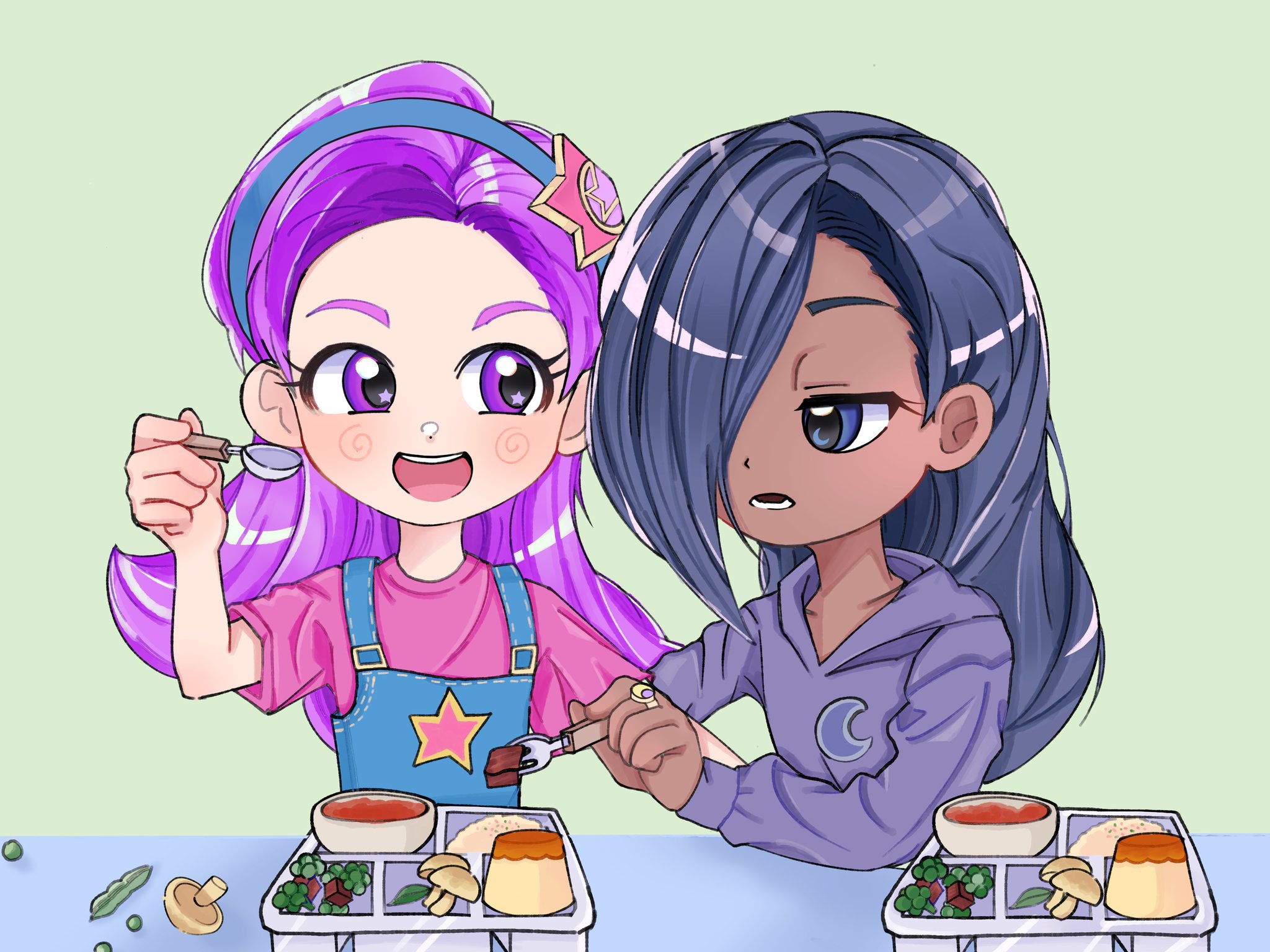 2girls blue_eyes blue_hair blue_hoodie blue_overalls blush bowl crescent_in_eye crescent_print dark_skin denim_overalls food fork fpzabeth hair_ornament hair_over_one_eye hairband highres holding holding_fork holding_spoon hood hoodie indigo_hair indigo_keen_(rainbow_bubblegem) jewelry long_hair long_sleeves looking_at_another mashed_potatoes multiple_girls mushroom open_mouth overalls peas pink_shirt print_hoodie print_overalls pudding purple_eyes purple_hair purple_star_(rainbow_bubblegem) rainbow_bubblegem ring shirt short_sleeves smile spoon star_(symbol) star_hair_ornament star_in_eye star_print symbol_in_eye table teeth tray upper_body