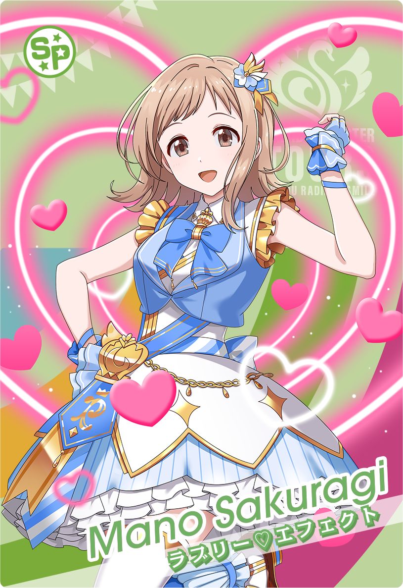 1girl brown_eyes brown_hair chain dress english_text fingerless_gloves flag frills gloves hair_ornament heart idol_clothes idolmaster idolmaster_shiny_colors idolmaster_tours japanese_text official_art open_mouth sakuragi_mano solo