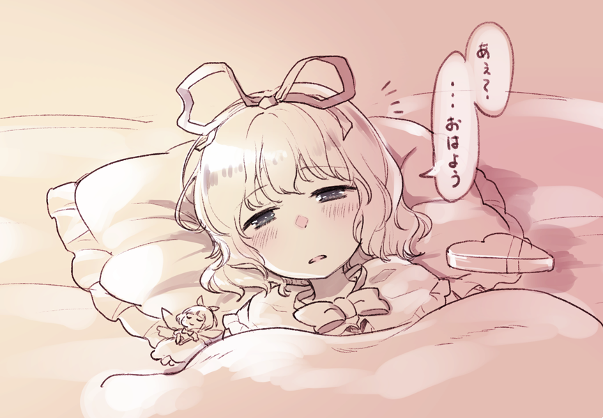 1girl bad_link blush bow bowtie box box_of_chocolates capelet closed_eyes commentary_request frilled_capelet frills hair_ribbon heart-shaped_box medicine_melancholy medium_hair mito_tsubaki monochrome narrowed_eyes notice_lines open_mouth pillow ribbon shiny_eyes sketch solo speech_bubble su-san touhou translation_request under_covers