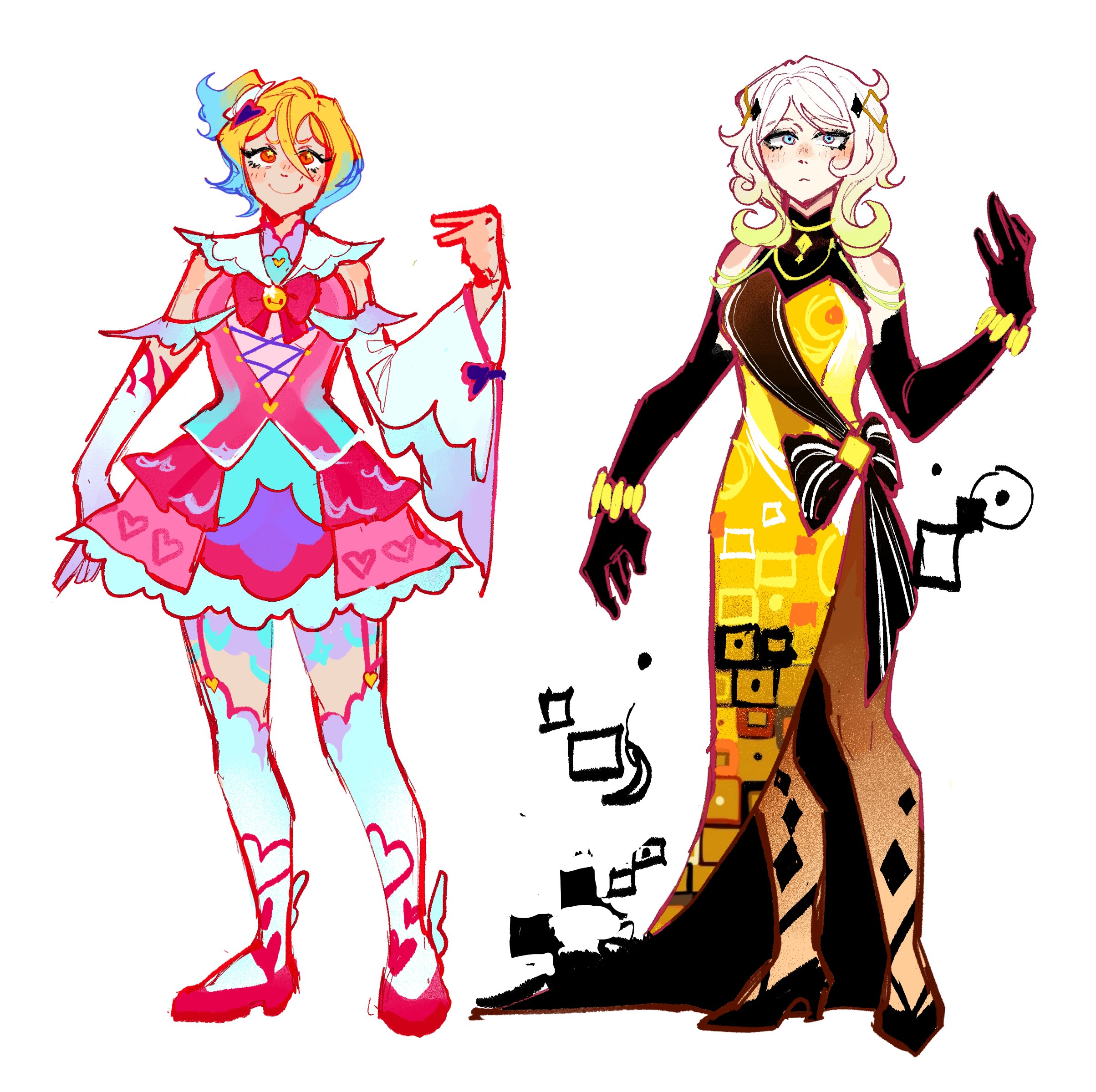 2girls alternate_costume black_bow black_bridal_gauntlets black_shoes blonde_hair blue_eyes blue_hair bow bowtie bracelet bridal_gauntlets detached_sleeves don_quixote_(project_moon) dress e.g.o_(project_moon) faust_(project_moon) full_body gold_rush_(e.g.o) gradient_hair highres in_the_name_of_love_and_hate_(e.g.o) jewelry lexia_solve_e limbus_company looking_at_viewer multicolored_hair multiple_girls pink_bow pink_bowtie pink_shoes pink_skirt pink_vest project_moon shoes short_hair simple_background skirt socks standing vest white_background white_hair white_sleeves white_socks yellow_dress yellow_eyes