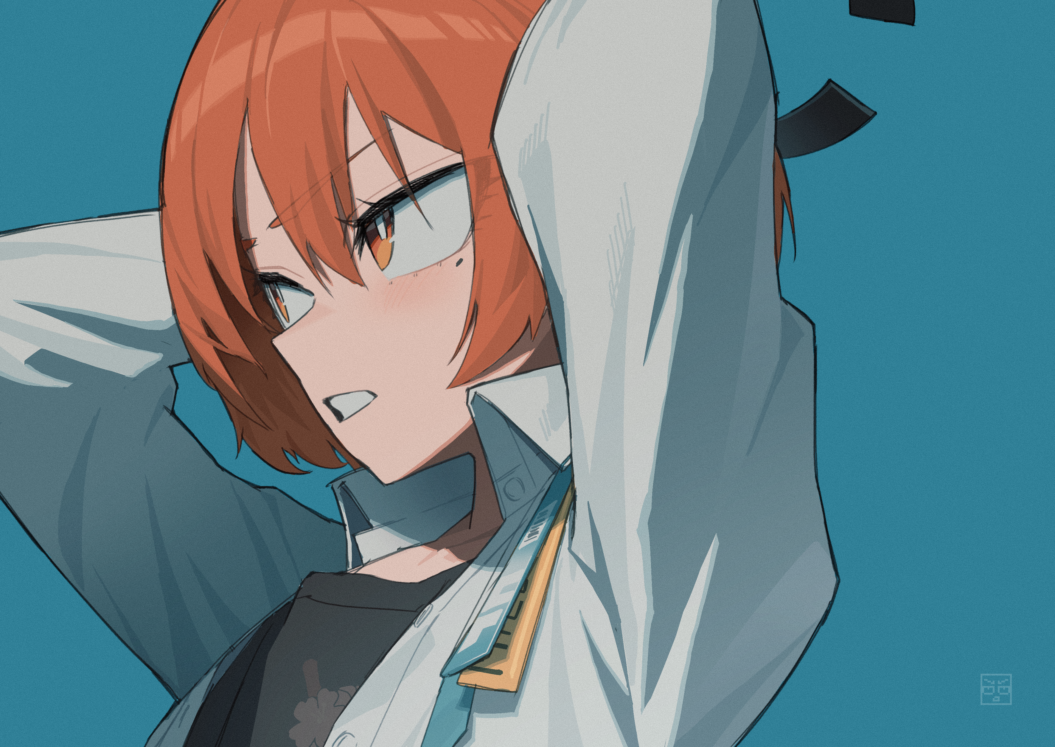 1girl absurdres arms_behind_head arms_up blast-7 blue_archive blue_background blush collared_shirt commentary hair_between_eyes halo highres long_sleeves mole mole_under_eye neru_(blue_archive) open_clothes orange_eyes orange_hair shirt short_hair simple_background solo upper_body white_shirt