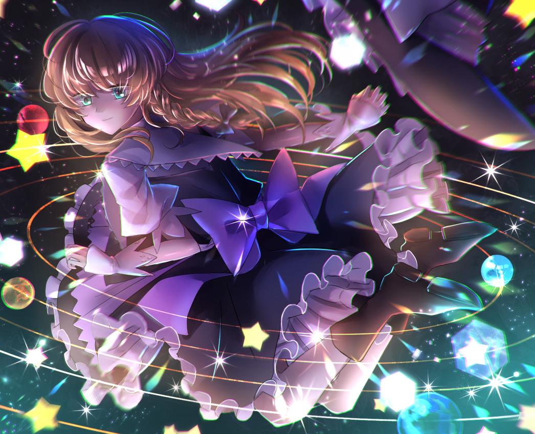 1girl back_bow black_background black_skirt black_vest blonde_hair bow braid commentary cube english_commentary fingerless_gloves flying gloves green_eyes hair_bow hat hat_bow kirisame_marisa knees light_particles light_smile long_hair orb puffy_short_sleeves puffy_sleeves purple_bow shirt short_sleeves single_braid skirt solar_system solo sparkle star_(symbol) touhou unworn_headwear vest white_gloves white_shirt witch_hat zukapin