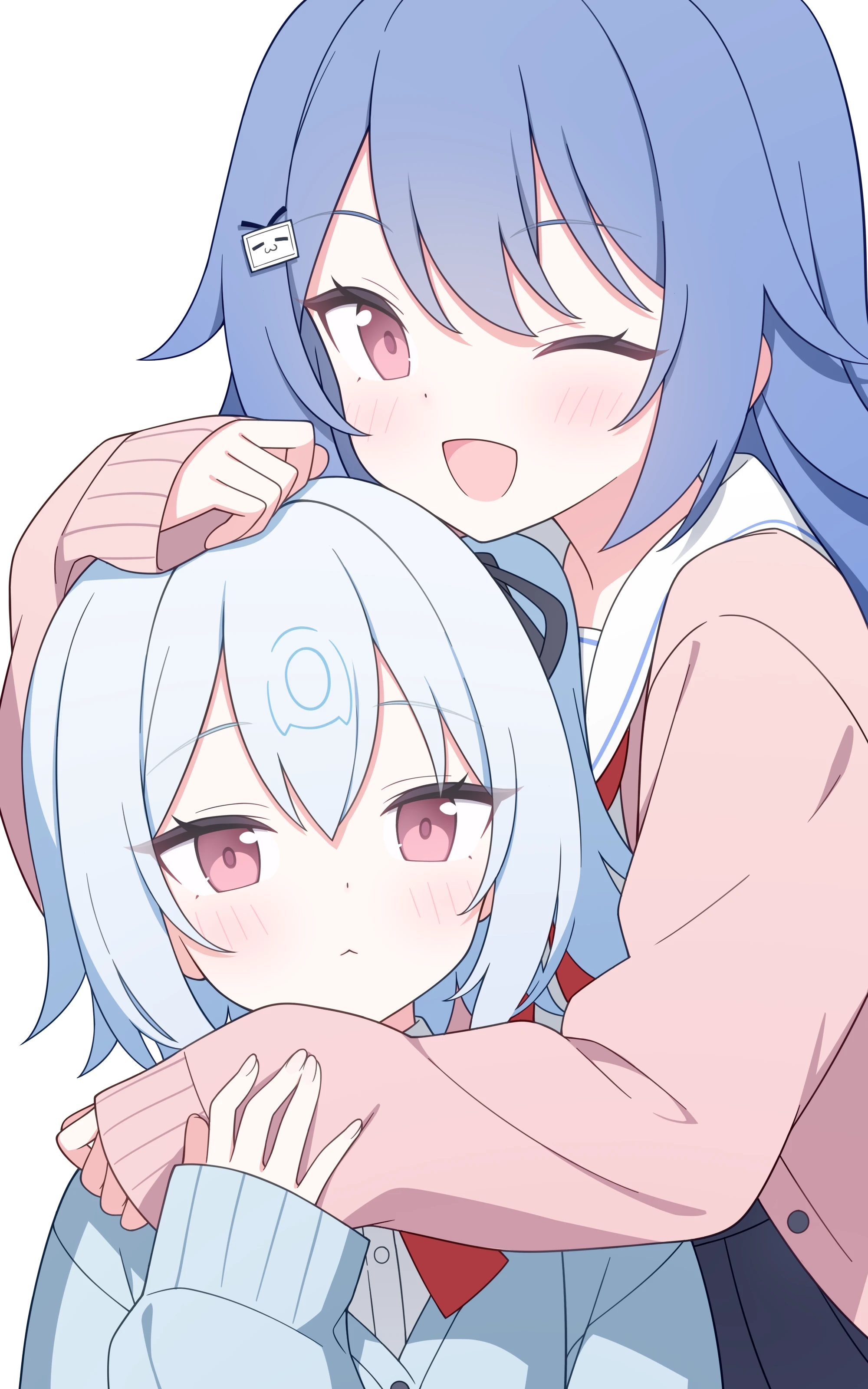 2girls :< ;d absurdres aqua_cardigan aqua_hair bili_girl_22 bili_girl_33 bilibili black_ribbon black_skirt blue_hair blush buttons cardigan chinese_commentary closed_mouth collared_shirt commentary double-parted_bangs dress_shirt eyes_visible_through_hair hair_between_eyes hair_ornament hair_ribbon hand_on_another's_head hand_on_another's_wrist highres jyt long_hair long_sleeves looking_at_viewer making-of_available multiple_girls neckerchief one_eye_closed open_cardigan open_clothes open_mouth red_cardigan red_eyes red_neckerchief ribbon sailor_collar school_uniform serafuku shirt short_hair side_ponytail sidelocks simple_background skirt sleeves_past_wrists smile tv_hair_ornament upper_body white_background white_sailor_collar white_shirt