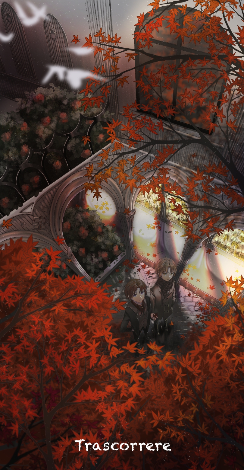 2boys arch arched_window architecture axis_powers_hetalia bird black_jacket black_pants black_scarf black_shoes blurry bolo_tie brothers brown_eyes brown_hair brown_jacket brown_shirt building bush collared_shirt commentary_request depth_of_field fence flower from_above grey_vest hand_in_pocket highres holding holding_leaf italian_text jacket jing_yao leaf long_sleeves looking_at_viewer looking_up male_focus maple_leaf maple_tree multiple_boys muntins northern_italy_(hetalia) open_clothes open_jacket orange_flower outdoors pants parted_bangs parted_lips pavement purple_eyes scarf shirt shoes short_hair siblings southern_italy_(hetalia) sunlight tree twins vest window