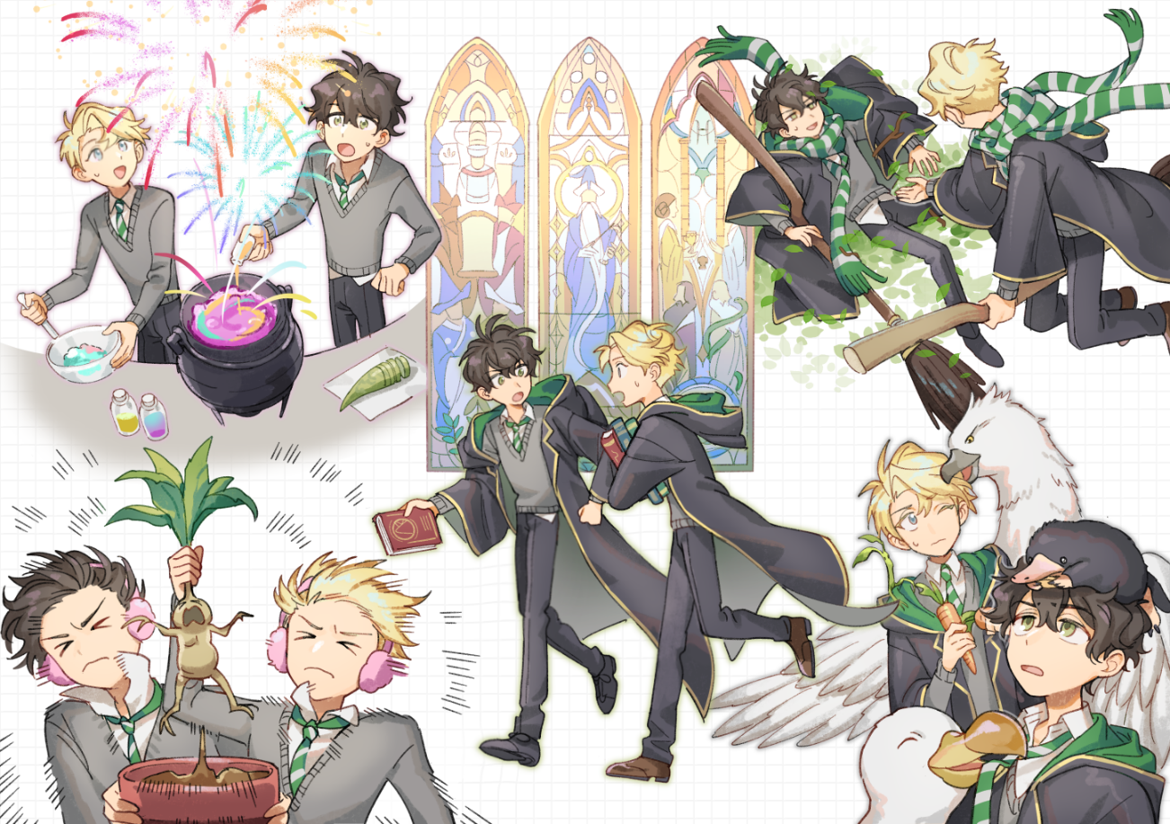 >_< 2boys albus_severus_potter black_hair black_robe blonde_hair blue_eyes bowtruckle broom broom_riding carrot cauldron green_eyes green_necktie harry_potter_(series) harry_potter_and_the_cursed_child hogwarts_school_uniform huan_li male_focus multiple_boys necktie niffler potion robe school_uniform scorpius_malfoy short_hair slytherin striped_necktie sweater vial wizarding_world