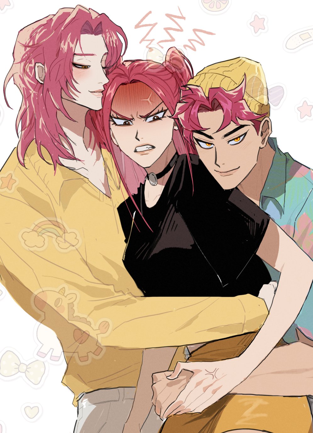 1girl 2boys abby_(kpop_demon_hunters) anger_vein angry beanie blush bul_jelly hat highres hug hug_from_behind kpop_demon_hunters long_hair mira_(kpop_demon_hunters) multiple_boys pink_hair red_hair romance_(kpop_demon_hunters) short_hair smile twintails yellow_eyes