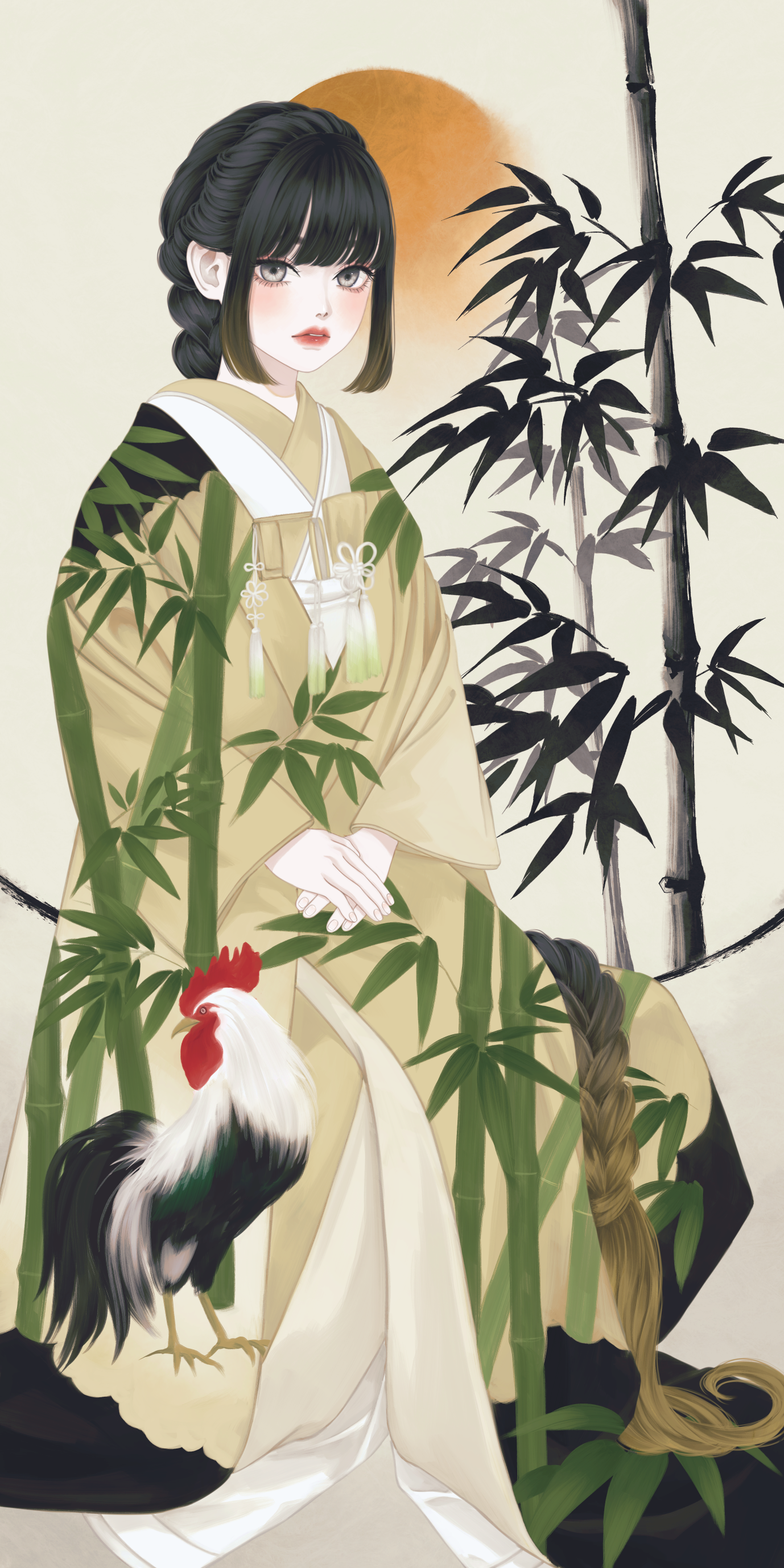 1girl absurdres bamboo bamboo_print bird black_hair braid chicken colored_tips highres japanese_clothes kimono lips long_hair long_sleeves looking_at_viewer multicolored_hair original own_hands_together print_kimono rooster sitting solo ushiyama_ame very_long_hair