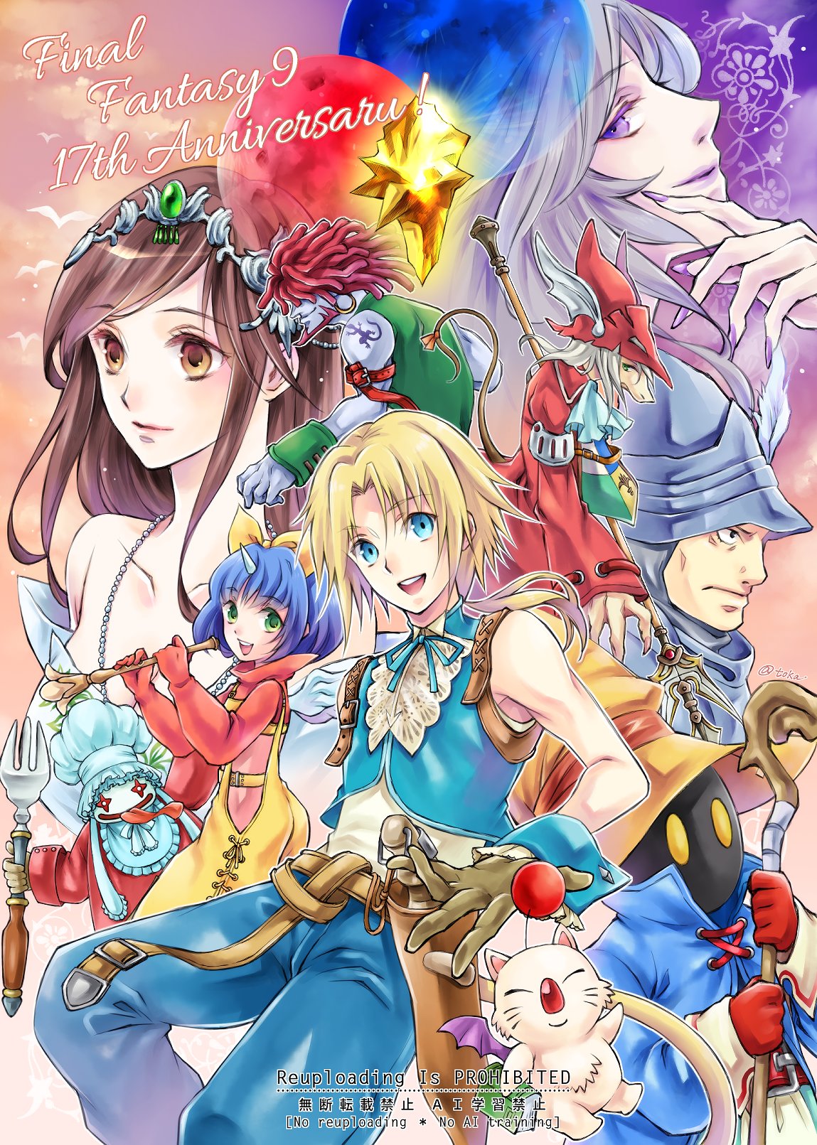 1other 3girls 5boys adelbert_steiner amarant_coral anniversary aqua_eyes aqua_ribbon aqua_vest aqua_wrist_cuffs arm_belt armor ascot bare_shoulders beard belt bib black_mage_(final_fantasy) blonde_hair blue_coat blue_hair blue_pants blue_skin bodysuit bow breasts brown_belt brown_eyes brown_hair burmecian chef_hat claws coat colored_skin creature cropped_sweater cropped_vest crown detached_sleeves dreadlocks dress eiko_carol facial_hair final_fantasy final_fantasy_ix fingernails fork freya_crescent garnet_til_alexandros_xvii gem gloves green_eyes green_gemstone green_vest green_wrist_cuffs grey_gloves grey_hair hair_between_eyes hair_bow hair_over_eyes hat hat_feather helmet highres holding holding_fork holding_instrument holding_polearm holding_staff holding_weapon horns instrument jewelry kuja long_fingernails long_hair low_ponytail medium_breasts mini_wings moogle mouse_girl multiple_boys multiple_girls neck_ribbon necklace official_alternate_costume open_mouth orange_ribbon overalls pants parted_bangs pink_bodysuit polearm ponytail purple_eyes purple_nails quichi_91 quina_quen red_coat red_gloves red_hair red_helmet red_sweater ribbon shirt short_hair shoulder_armor shoulder_tattoo single_horn smile staff striped_clothes striped_pants sweater tabard tail tail_ornament tail_ribbon tattoo tongue tongue_out trap twitter_username upper_body vest vivi_ornitier weapon white_ascot white_dress white_shirt white_sleeves winged_helmet wings wizard_hat wrist_cuffs yellow_bow yellow_eyes yellow_overalls zidane_tribal