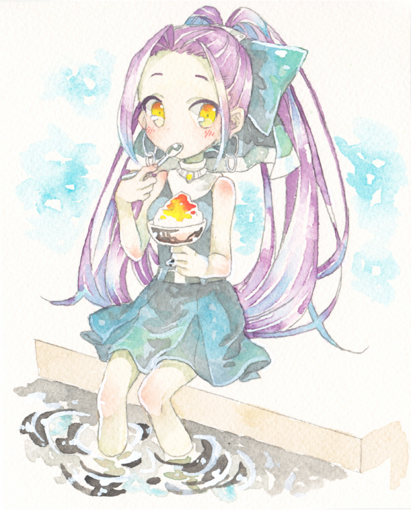 1girl ahoge blue_dress bow cup dress emil_chronicle_online food hair_bow holding holding_cup holding_spoon huge_ahoge long_hair mokuju_alma partially_submerged poolside purple_hair shaved_ice shinomaru_hajime sleeveless sleeveless_dress solo split_ponytail spoon yellow_eyes