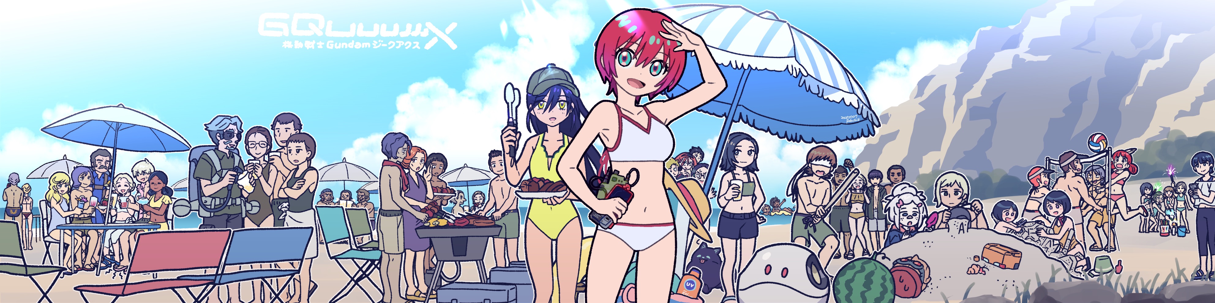 6+boys 6+girls absurdres amate_yuzuriha ball bask_om beach beach_umbrella black_hair blindfold blonde_hair blue_eyes blue_hair brown_hair building_sand_sculpture buried_in_sculpted_sand cellphone challia_bull character_request cloud commentary_request conch_(gundam) crossed_arms deux_murasame drink everyone facial_hair fireworks food freckles fruit gates_capa glasses grey_hair grill gundam gundam_gquuuuuux hair_ornament haro hat hermit_crab highres holding holding_drink holding_tongs innertube lalah_sune long_image lotion male_swimwear mole mole_under_eye multiple_boys multiple_girls mustache navel nyaan_(gundam_gquuuuuux) ochishima one-piece_swimsuit open_mouth orange_hair phone red_hair sand_bucket sand_sculpture scar scar_across_eye scar_on_face shiiko_sugai shiiko_sugai's_son shish_kebab smile suikawari sunglasses sunscreen swim_ring swim_trunks swimsuit tongs umbrella visor_cap volleyball_(object) volleyball_net watermelon wide_image yellow_eyes