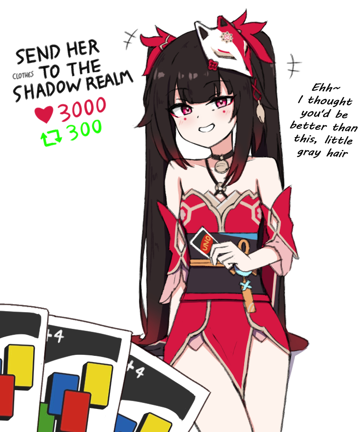 +++ 1girl bare_legs bare_shoulders black_choker black_gloves black_hair breasts card chirun0 choker collarbone commentary criss-cross_halter crossed_legs detached_sleeves english_commentary english_text eyeliner facial_mark fox_mask gloves gradient_hair grin hair_ornament halterneck hand_rest holding holding_card honkai:_star_rail honkai_(series) japanese_clothes kimono light_blush long_hair long_sidelocks looking_at_viewer makeup mark_under_eye mask meme multicolored_hair o-ring obi obijime pelvic_curtain pendant_choker playing_games pov red_eyeliner red_eyes red_hair red_kimono sash short_sleeves sidelocks simple_background single_glove small_breasts smile solo_focus sparkle_(honkai:_star_rail) standing tilted_headwear twintails twitter_strip_game uno_(game) very_long_hair white_background