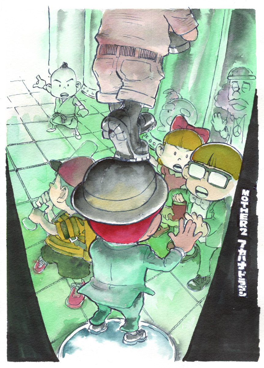 1girl 6+boys akahanadragon backpack bag baseball_bat baseball_cap belt binoculars black_hair blonde_hair boots bow bowtie braid doseisan dougi formal_clothes from_above full_body glasses hair_bow hat highres hippie jeff_andonuts karate_gi laboratory looking_to_the_side mother_(series) mother_2 multiple_boys ness_(mother_2) new_age_retro_hippie nintendo open_mouth paula_(mother_2) pointing poo_(mother_2) red_hair shirt shoes shorts sneakers striped_clothes striped_shirt suit tessie-watching_club tile_floor tiles tony_(mother_2) topknot